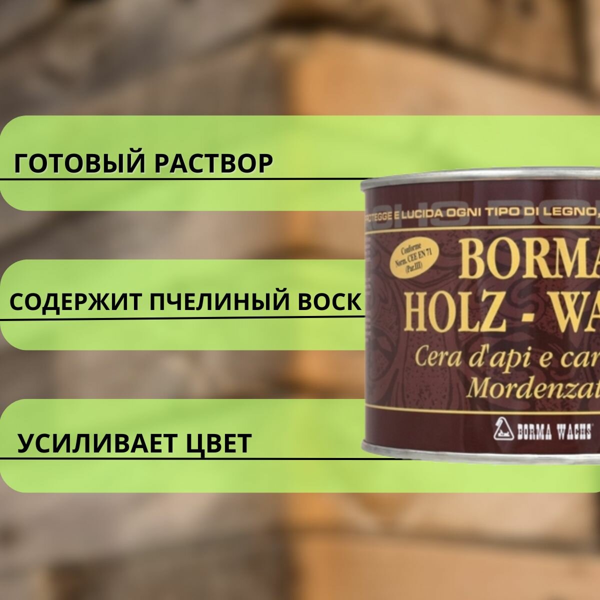 Профессиональный продукт, содержащий природные воски минерального, животного и растительного происхождения, предотвращающие образование трещин, царапин на любых деревянных поверхностях. Его защитная способность обусловлена присутствием люминесцентных добавок, усиливающих цвет и внешнюю теплоту древесины, ретушируя возможные повреждения. Пропитывает, восстанавливает, защищает, полирует любые породы дерева. Особенно рекомендуется для высококачественной мебели. Содержит природный пчелиный воск и воск карнаубы. Предотвращает появление древесных червей.