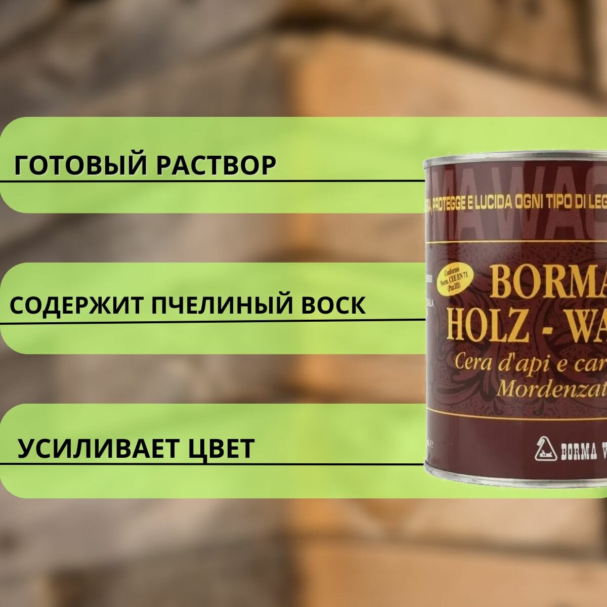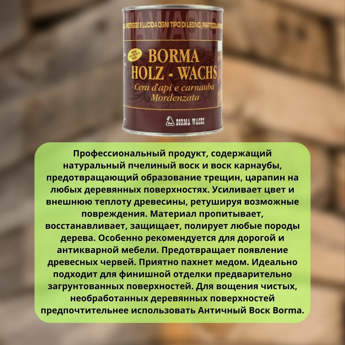 Идеально подходит для финишной отделки предварительно загрунтованных поверхностей. Для вощения чистых, необработанных деревянных поверхностей предпочтительнее использовать Античный Воск Borma.