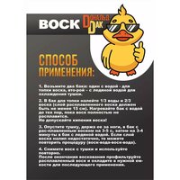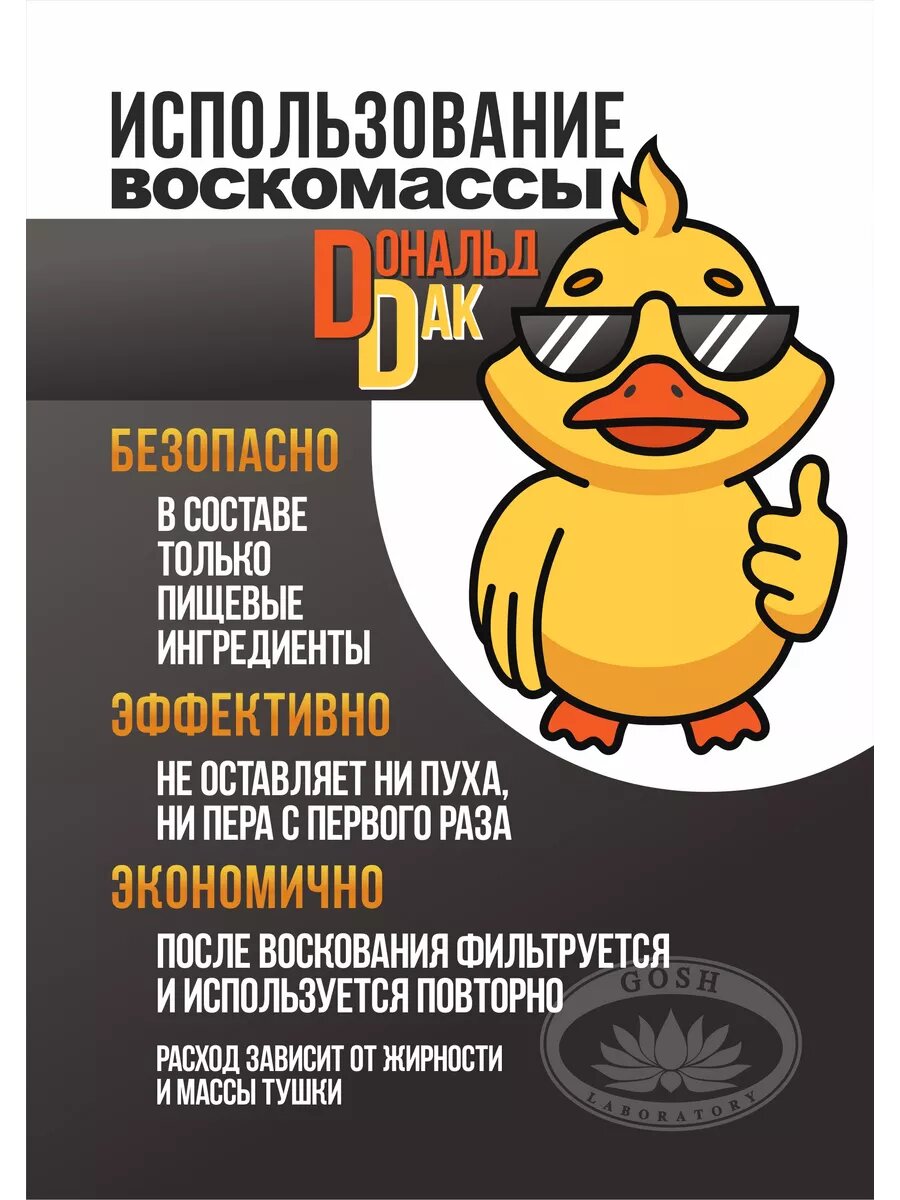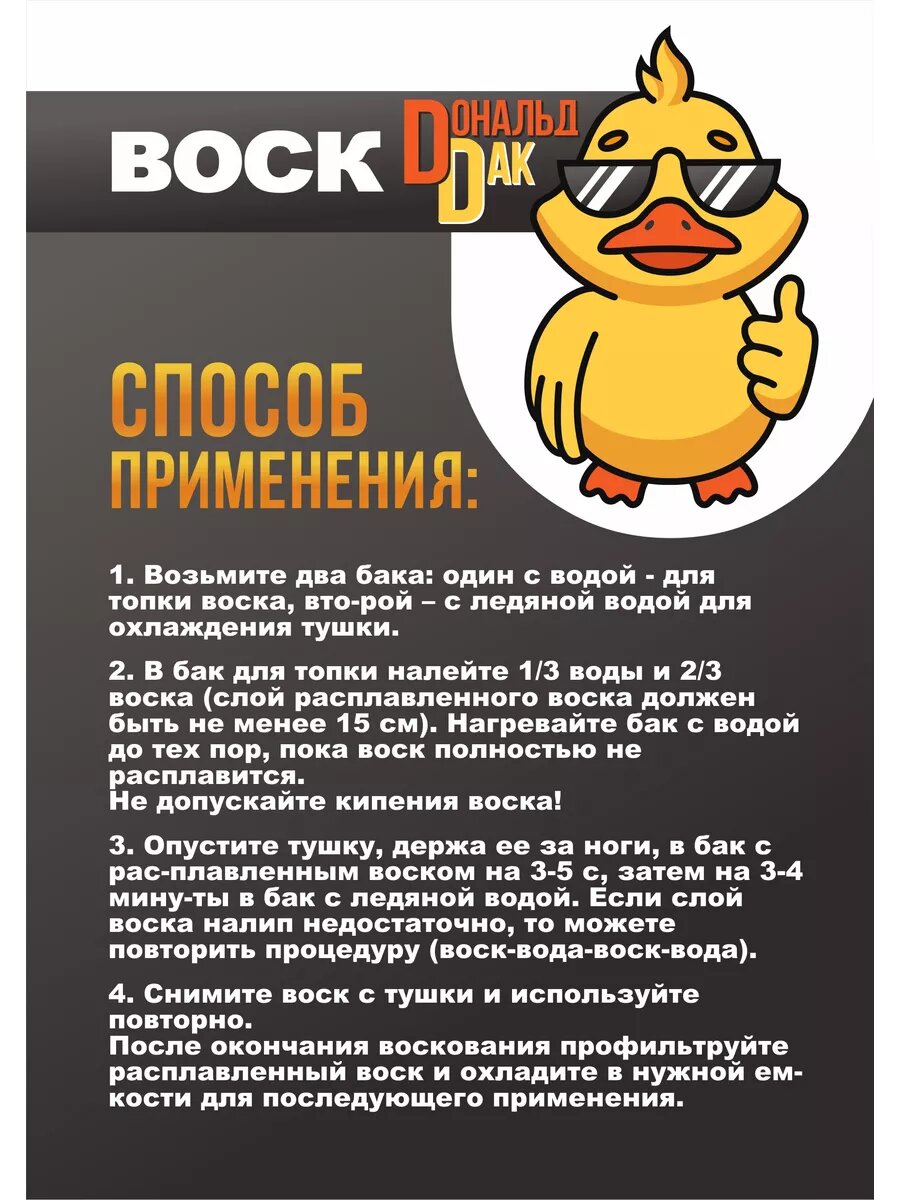1. Возьмите две емкости: одну с водой - для топки воска, вторую – с ледяной водой для охлаждения тушки. 2. В емкость для топки налейте 1/3 воды и 2/3 воска. Нагревайте воду до тех пор, пока воск полностью не расплавится. Не допускайте кипения воска! 3. Опустите тушку, держа ее за ноги, в емкость с расплавленным воском на 3-5 с, затем на 3-4 минуты в бак с ледяной водой. Если слой воска налип недостаточно, то можете повторить процедуру (воск-вода-воск-вода). 4. Вручную снимите воск с тушки и используйте повторно. После окончания воскования профильтруйте расплавленный воск и охладите в нужной емкости для последующего применения. Не токсичен. Без запаха. Продукт сертифицирован. Подходит под стандарты Халяль / Halal. Основные ингредиенты: парафин, воск Производим воскомассу с 2009 года в соответствии с ТУ 0255-015-11084661-2015. Меры предосторожности: проводите воскование на открытом воздухе или в хорошо вентилируемом помещении. Не допускайте кипения воска.
