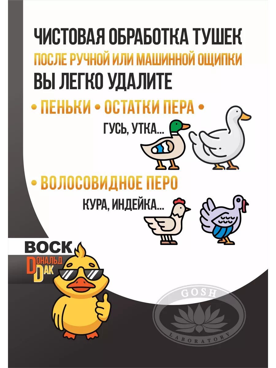 Воск для ощипа птицы предназначен для финальной очистки от пеньков (утки, гуси), волосовидного пера (куры, индейки, перепела). Используется после ручной ощипки или перосъемной машины.