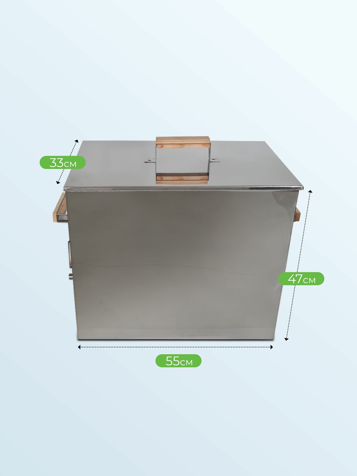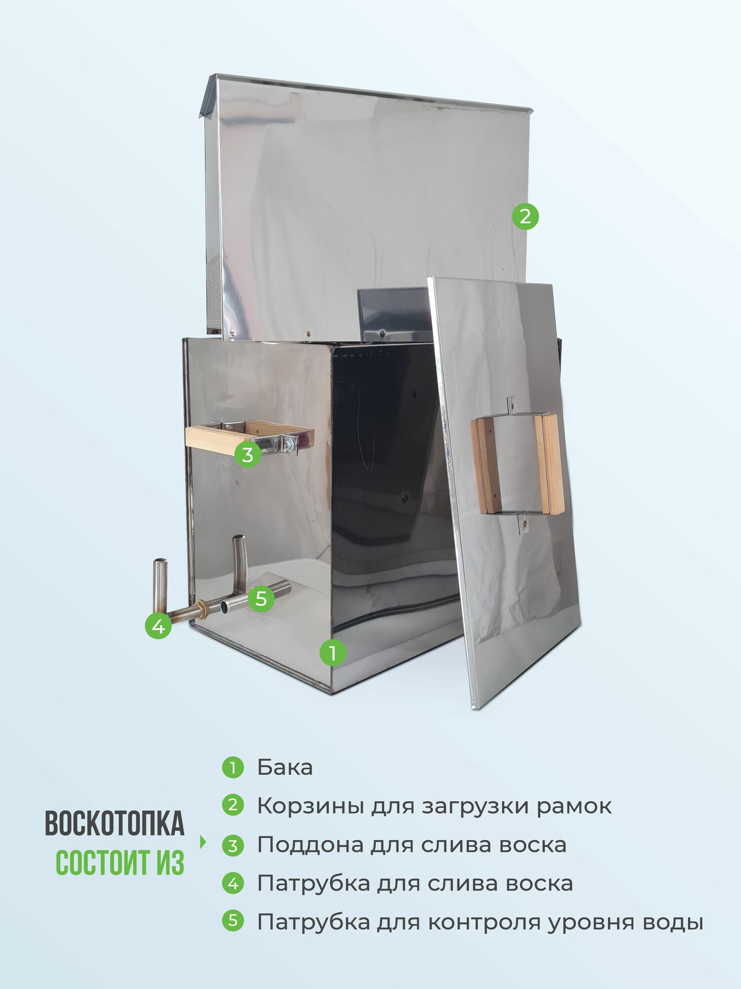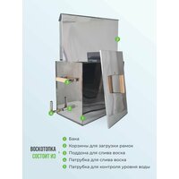 Корпус воскотопки выполнен из нержавеющей стали, что обеспечивает долговечность и устойчивость к коррозии.