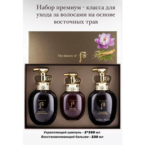 Роскошный SPA набор для волос The History of Whoo Whoospa Hair 3 Set включает восстанавливающий шампунь 2шт. по 350 мл. и кондиционер 1шт. по 220мл. Корейский люксовый шампунь Whoo Spa Essence Shampoo интенсивно восстанавливает структуру волос, питает волосы от корней, восстанавливает кровообращение, препятствует появлению перхоти и выпадению волос. Лечебный шампунь укрепляет волосяную луковицу. Подходит для всех типов волос. Рекомендуется для ежедневного использования. Восстанавливающий корейский кондиционер - ополаскиватель для всех типов волос Whoo Spa Essence Rinse 220мл. интенсивно питает, увлажняет, восстанавливает текстуру волос, шелковистость и природный блеск волос, препятствует появлению перхоти.