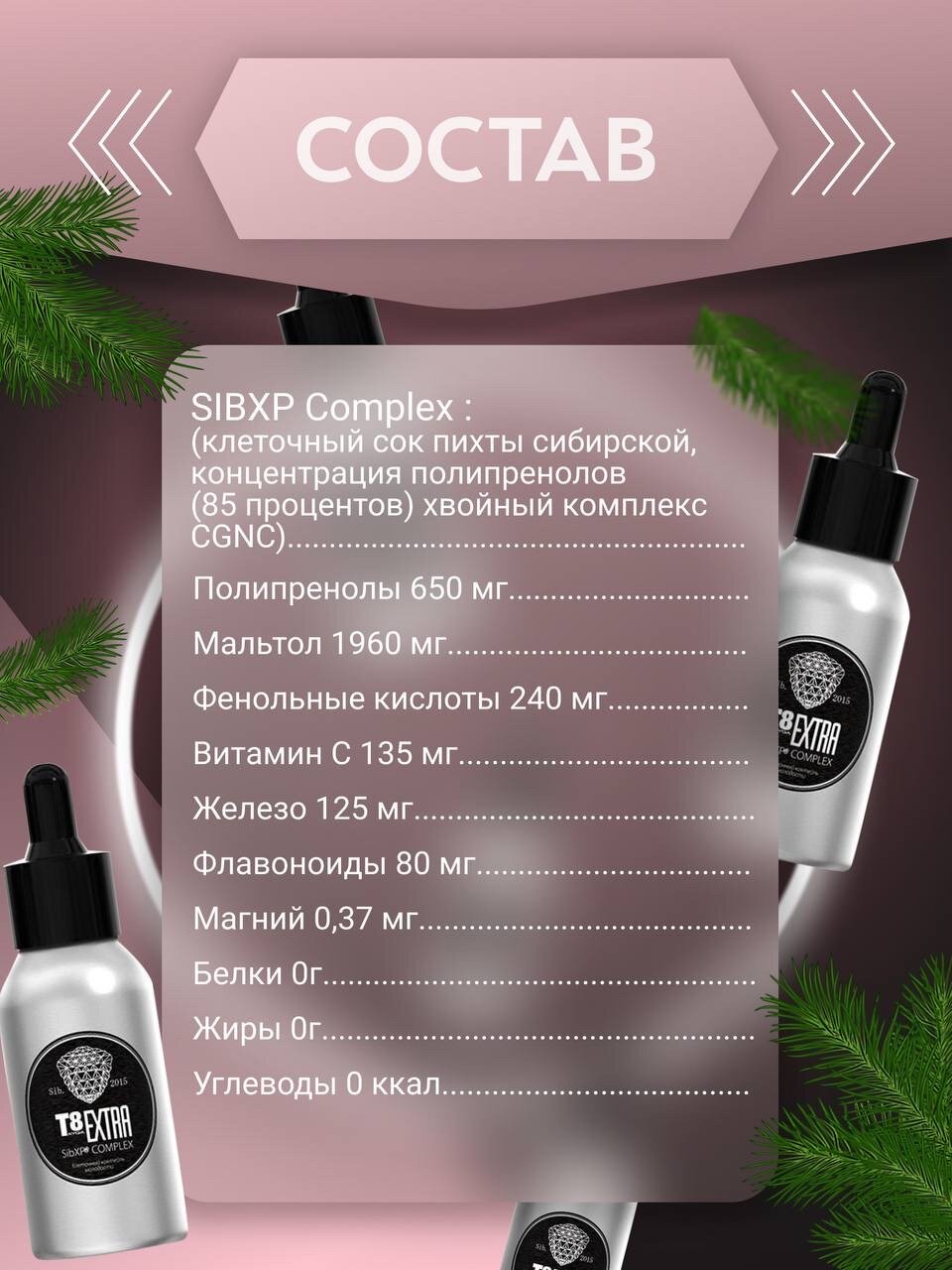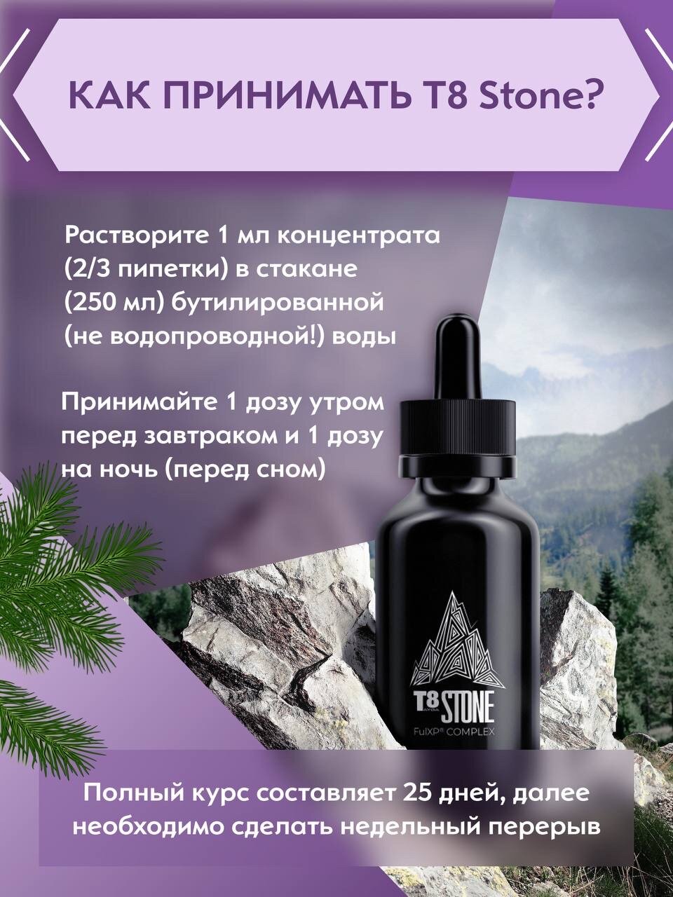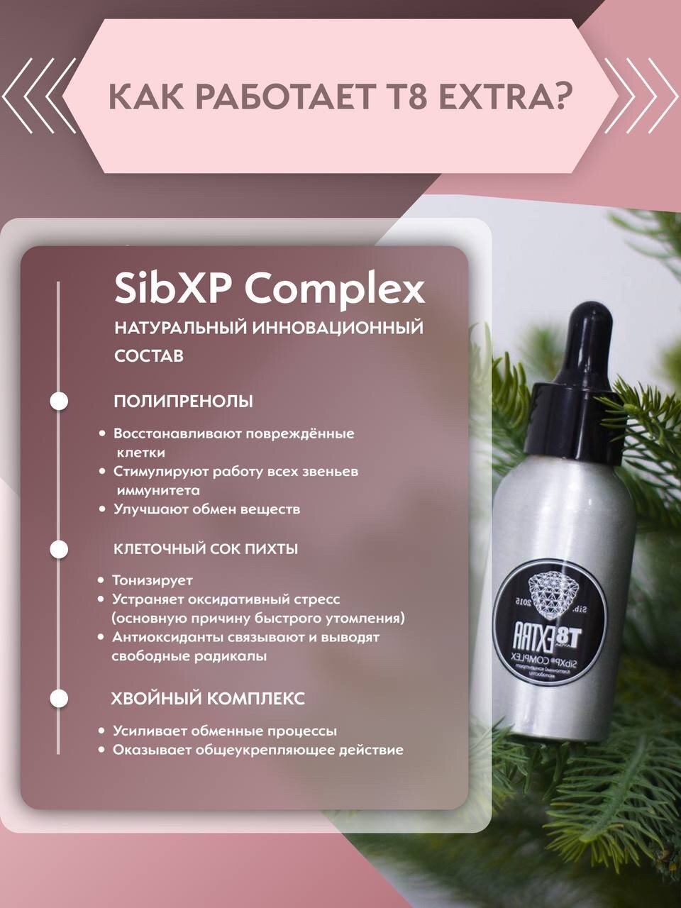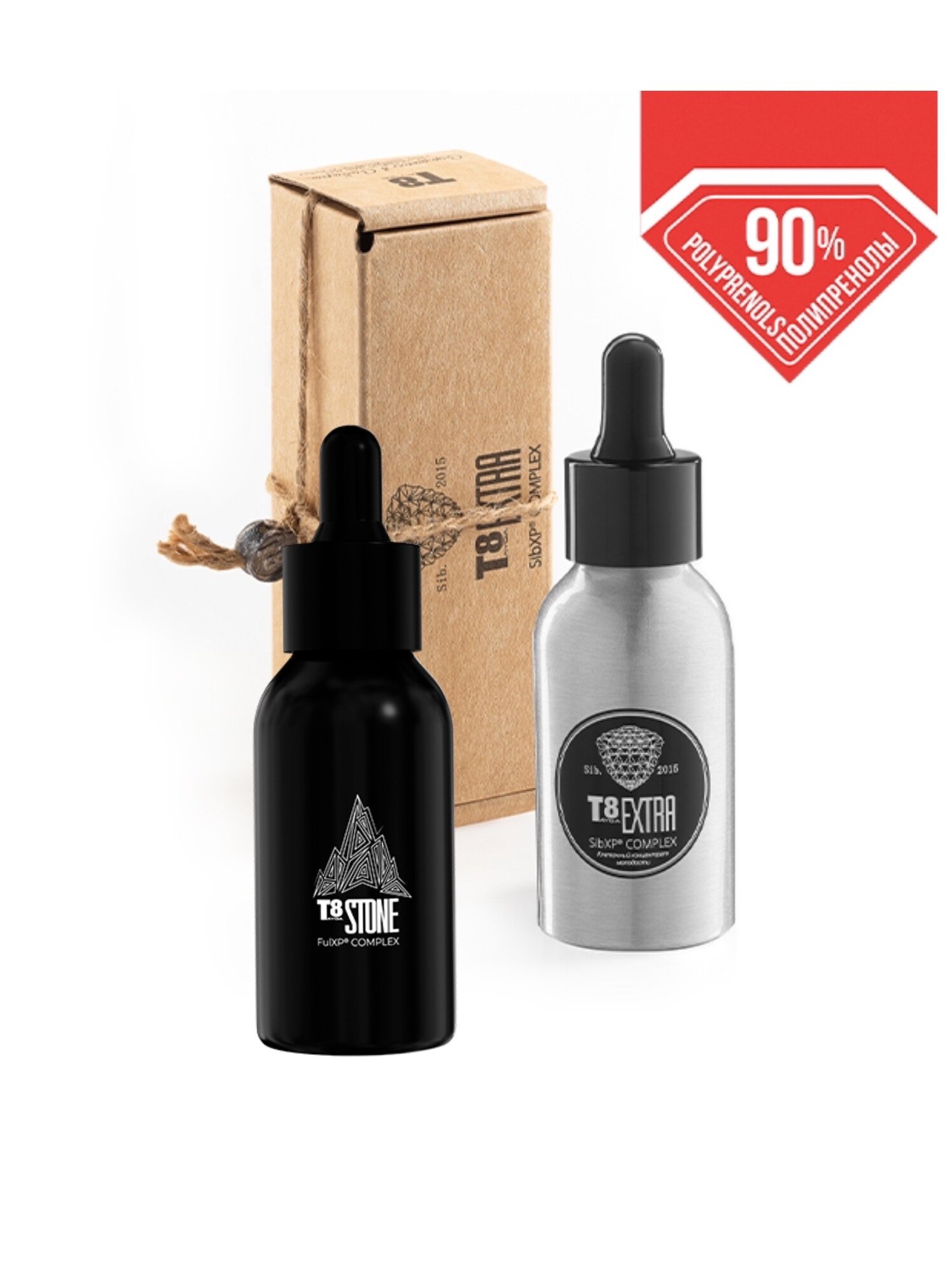 | Состав | T8 Extra: SibXP Complex (увеличенная порция клеточного сока пихты сибирской, полипренолы (концентрация 90%), хвойный комплекс СGNC). T8 Stone: Комплекс солей гуминовых, гиматомелановых и фульвовых кислот, азотно-кислое серебро (Ag +), вода дистиллированная. |