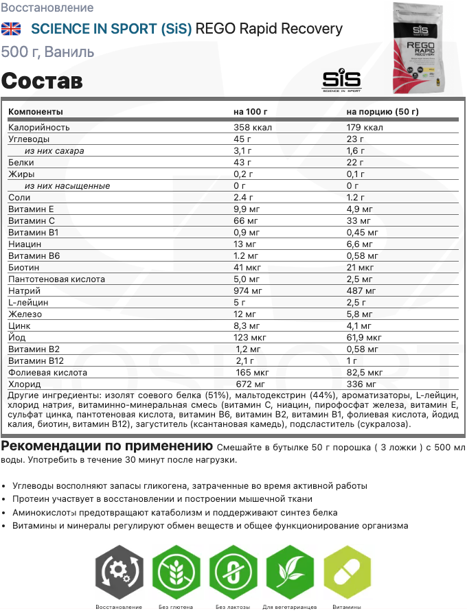 SCIENCE IN SPORT (SiS) REGO Rapid Recovery 500 г, Ваниль: сравнение цен, характеристики, фото, актуальное наличие и цены.