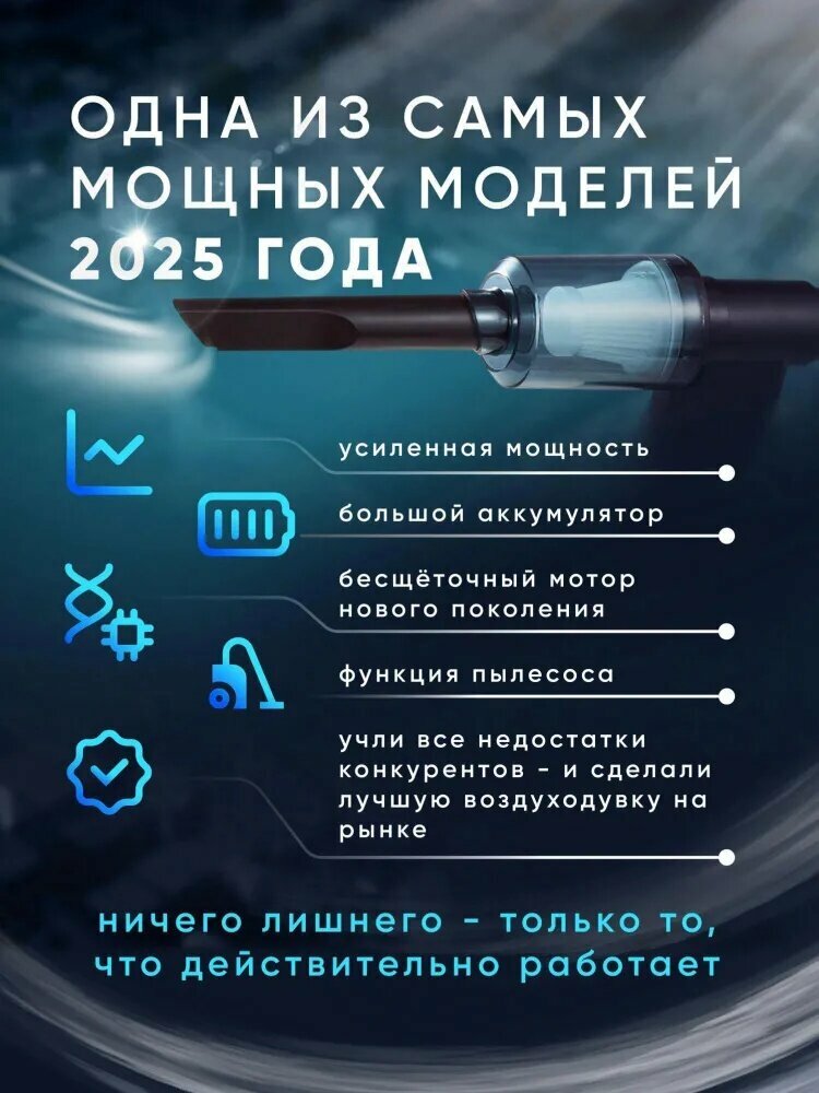 Представляем вашему вниманию портативную воздуходувкуИдеальное устройство для тех, кто ценит скорость и эффективность в уборке. Она станет вашим незаменимым помощником как в домашних условиях, так и на улице. Аккумуляторная воздуходувка имеет потрясающие характеристики, прочнейший корпус, бесщеточный мотор, фонарик для освещения зоны работы и имеет самый удобный хват, с которым она будет удобна для рукой руки! Не упустите шанс приобрести нашу мощную аккумуляторную воздуходувку! Она сделает вашу жизнь проще, а задачи быстрее. Заказывайте сейчас и оцените качество и удобство уже сегодня! ПрименениеВы можете использовать воздуходувку для задач связанных с автомобилем. Помимо этого, летом в сезон шашлыков актуально использовать как розжиг мангалов, раздуть костер. Для домашних задач также очень полезная вещь, воздуходувка способна справляться с различными задачами - от удаления листьев и мусора на вашем участке до очистки автомобиля от пыли или снега или же очищения клавиатуры компьютера. Компактность и портативностьВетродуйка имеет малый размер и легкий вес. Легко переносить и хранить. Вы можете легко хранить ее в ящике для инструментов, сумке или даже кармане, не занимая много места. Проста в использовании в любое время и в любом месте. КомплектацияВ комплекте к воздуходувка аккумуляторная мощная также прилагается две самых необходимых насадки, с которыми Вы выдуете всё, что захотите, из самых труднодоступных мест. Не упустите возможность приобрести мощную воздуходувку, которая сделает уборку лёгкой и приятной! Обеспечьте себе комфорт и чистоту в любой ситуации с нашим многофункциональным устройством. Комплектация✔ Воздуходувка аккумуляторная ✔ Контейнер с нера фильтром ✔ Насадка щелевая ✔ Насадка-щётка ✔ USB Type-C кабель для зарядки ✔ Инструкция