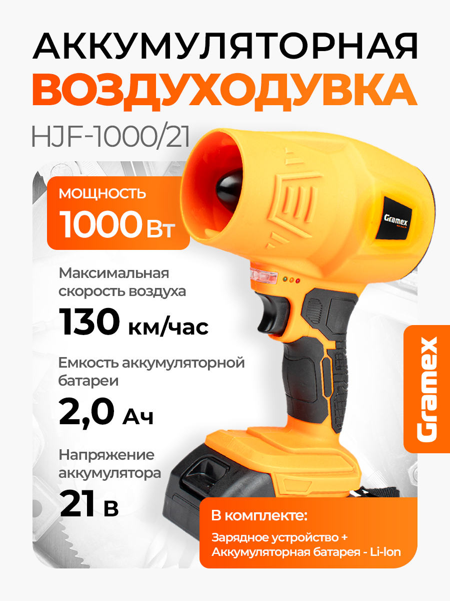 Воздуходувка аккумуляторная GRAMEX HJF-1000/21 (21 Вт, 130 км/час, аккум Li-2,0А/ч) картон, 1 акб: сравнение цен, характеристики, фото, актуальное наличие и цены.