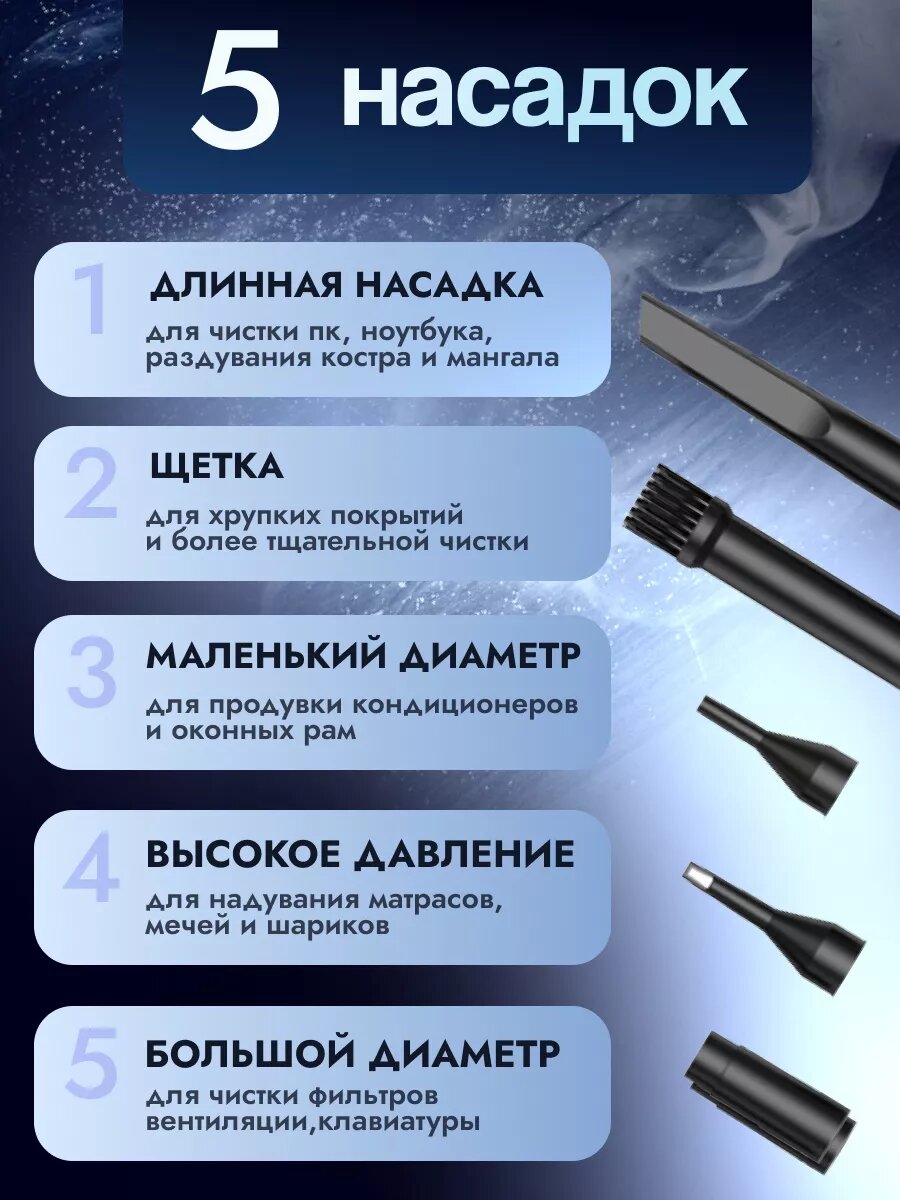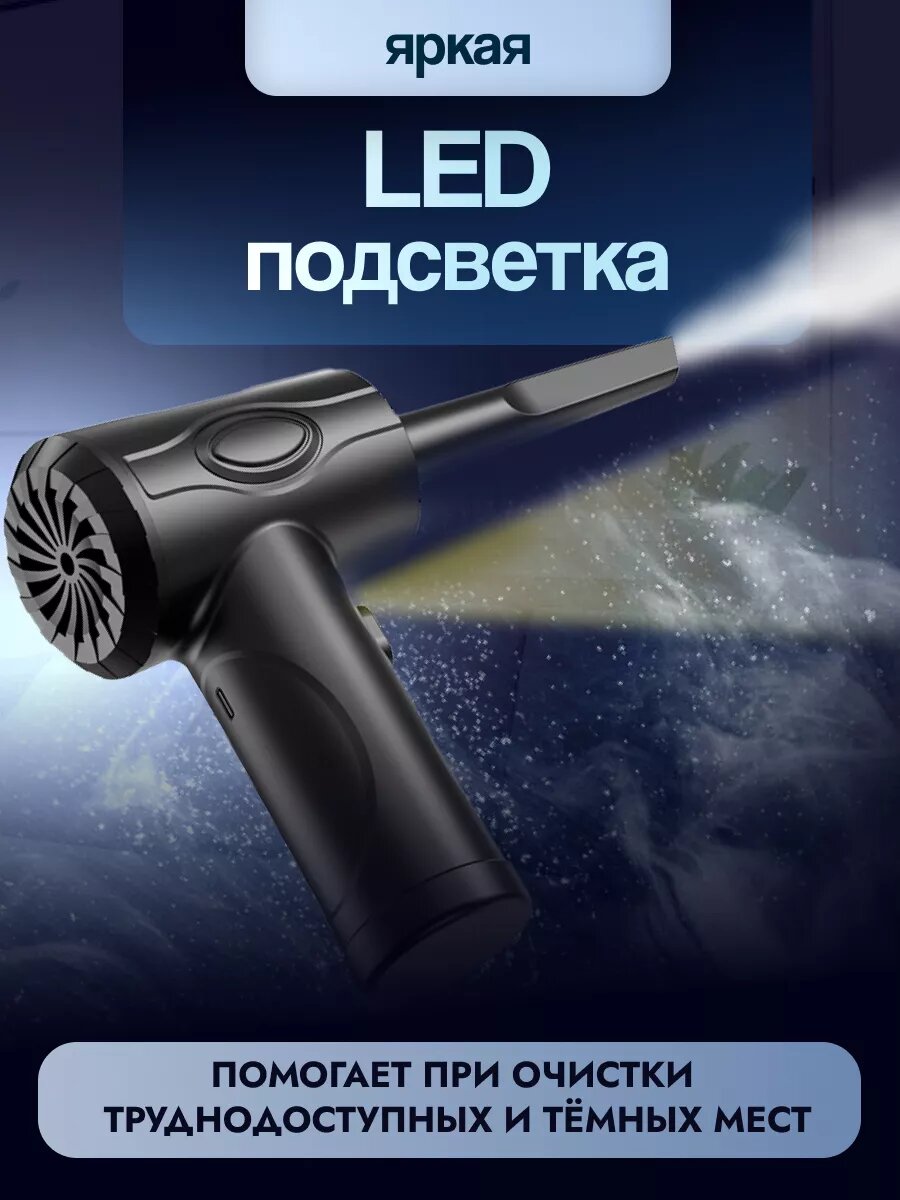 Портативная электрическая воздуходувка мини высокого давления изготовлена из прочного и легкого пластика, что делает ее идеальным спутником для различных задач. Эта аккумуляторная воздуходувка станет незаменимым инструментом для очистки от пыли не только вашего компьютера и ноутбука, но и клавиатуры, электроники, а также мебели и автомобильного салона.