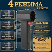Воздуходувка является многофункциональным устройством, которая подойдет для машины, для ухода за садом и деревьями. Автомобильный воздуходув представляет собой устройство, предназначенное для очистки и сушки различных частей автомобиля от пыли и грязи, пыли и других мелких частиц с поверхности деревьев и садовых участков. Это оборудование работает за счёт создания мощного потока воздуха, выбрасываемого с высокой скоростью. Воздуходувки часто используются для удаления листвы, песка и других мелких частиц с кузова и стекол автомобиля. Они также могут эффективно применяться для сушки поверхности машины после мойки, что помогает избежать образования водяных пятен. Турбо воздуходувка - это мощное устройство, создающее воздушный поток сильнее урагана и предназначенное для быстрого и эффективного устранения пыли, грязи, воды, снега и других загрязнений с различных поверхностей. Благодаря своей высокой мощности, турбина справляется даже с наиболее трудными задачами. Его корпус прочный и надежный, что позволяет выдерживать интенсивные нагрузки и обеспечивает продолжительный срок службы. Имеется 4 режима работы, включая турбо-режим, и яркая LED подсветка для комфортного использования в любое время суток. Имеет ЖК-экран с индикацией режимов работы для удобного управления. Батарея с емкостью 4000 мАч позволяет работать не менее 80 минут на минимальной скорости ветра, в турбо-режиме - около 8-10 минут. На максимальной скорости устройство развивает ветер до 60 м/с, а диаметр выходного отверстия составляет 64 мм, что способно создать ураган на ограниченной территории! Турбовентилятор идеально подходит для использования в различных областях: в домашнем хозяйстве, строительстве, садоводстве и промышленности. Он станет незаменимым помощником для тех, кто стремится поддерживать чистоту и порядок, а также добиваться высоких результатов в работе. Закажите турбо воздуходувку сегодня и почувствуйте настоящую мощь ветра! Характеристика: Напряжение: 16.8 В Емкость батареи: 4000мАч Время зарядки: около 3 часов Скоростной режим: 4 режима Вес турбофена: 810гр Размер турбофена: 270*110*72мм