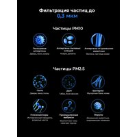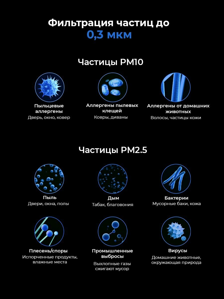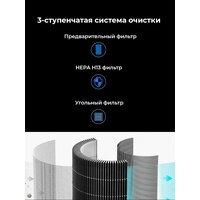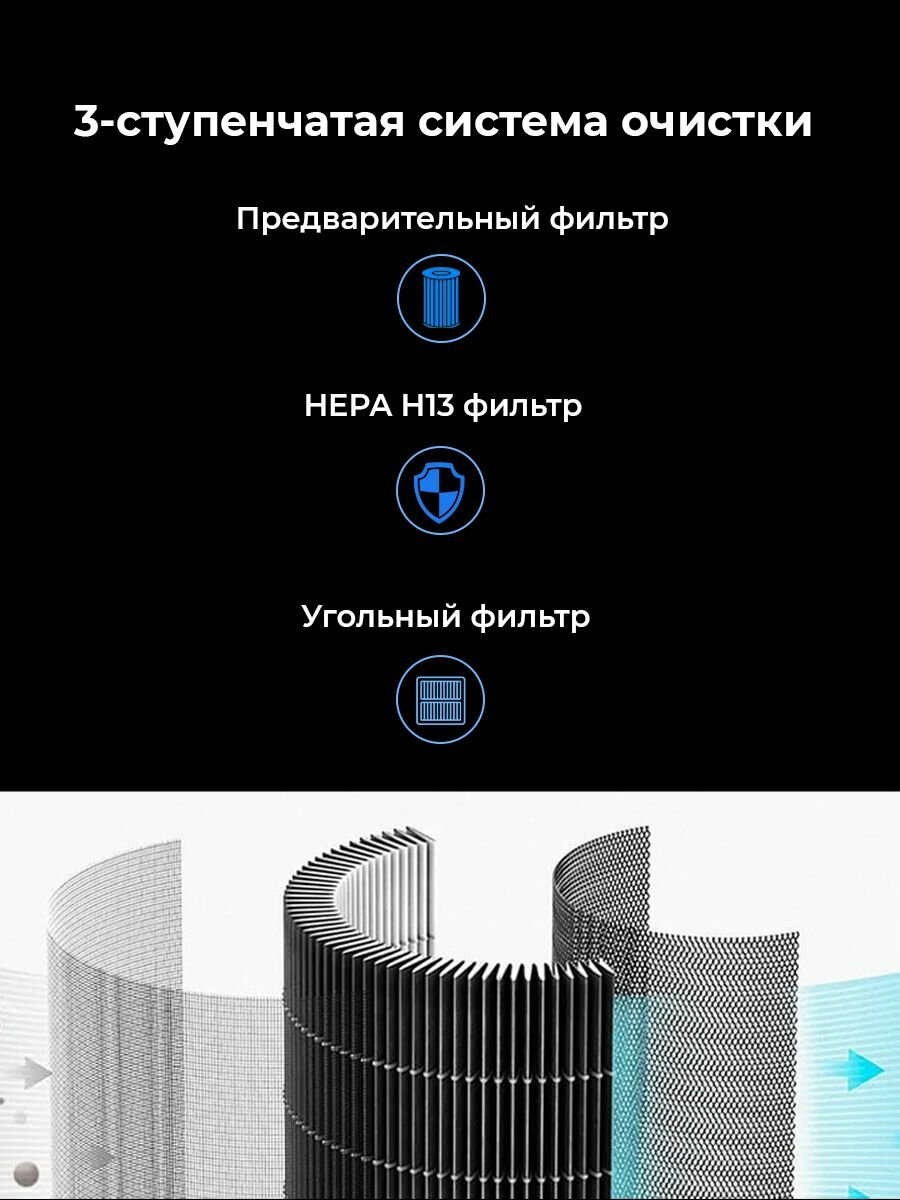 Включает фильтр предварительной очистки, HEPA H13 и угольный фильтры. Предварительный фильтр удерживает крупные частицы, например, шерсть домашних животных и пыль. HEPA-фильтр H13 эффективно удаляет до 99,97% микрочастиц размером до 0,3 мкм, включая пыльцу, аллергены и бактерии. Угольный фильтр нейтрализует неприятные запахи, табачный дым и вредные газы. Таким образом обеспечивается комплексная защита воздуха.