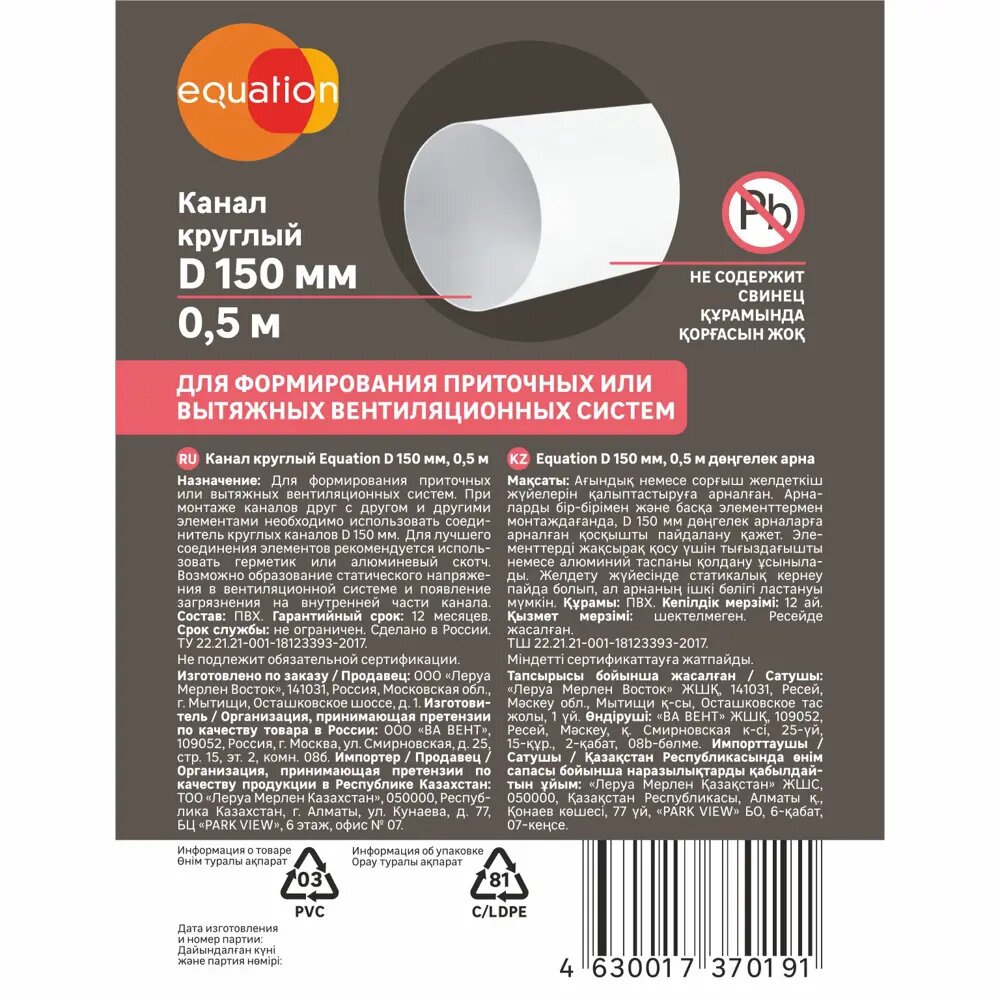Канал круглый D150 мм 0,5 м – используется для формирования приточных или вытяжных вентиляционных систем. Производится из ПВХ белого цвета и не содержит свинец. При монтаже каналов друг с другом и другими элементами необходимо использовать соединитель круглых каналов D 150 мм (арт. 18156142). Преимущества: очень быстрый монтаж с минимумом инструментов; легкое соединение с другими деталями вентиляционных систем любой сложности; достаточно приемлемая цена для большого круга покупателей. Не содержит свинец. При изготовлении используется кальций-цинковый стабилизатор. Мы не используем при изготовлении продукции свинец, так как мы заботимся о здоровье наших клиентов. Свинец -отравляющее вещество, которое входит в 10-ку самых опасных химических веществ по заключению ВОЗ. Имеет свойство накапливаться в организме человека и может привести к серьезным заболеваниям. Страна производства: Россия Тип продукта: Вентиляционный канал Марка: EQUATION Диаметр (мм): 150 Длина (м): 0.5 Основной материал: ПВХ
