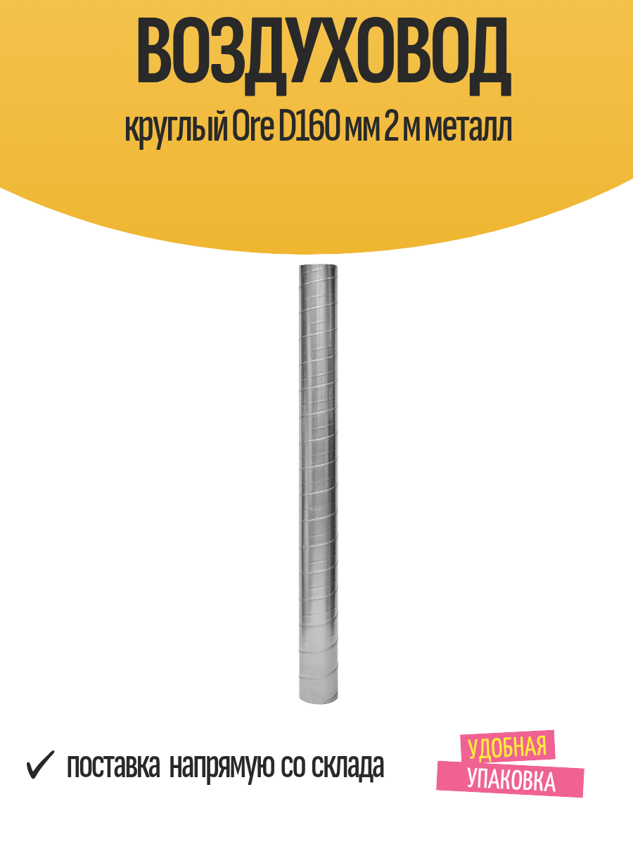 Воздуховод круглый Ore — основной элемент в системе приточно-вытяжной вентиляции. Канал выполнен из ленточной оцинкованной стали, устойчивой к коррозии и перепадам температур. Спиральный фальц придает конструкции дополнительную жесткость. Воздух внутри трубы распределяется равномерно и перемещается тихо даже при высоких скоростях и давлении. Схема прокладки воздуховодов подбирается индивидуально. Прямые участки собирают ниппельным методом. Особенности:- диаметр подключения воздуховода — 160 мм;- тип изделия — спирально навивной;- толщина стали — 0,5 мм;- длина изделия — 2 м;- вес упаковки — 2,4 кг.
