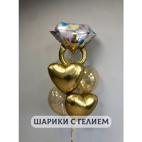 В состав композиции входят фольгированные шары в форме сердца золотого цвета и кольца, а также воздушные шары с золотым конфетти. Все шары выполнены из латекса и фольги, что делает их прочными и долговечными.