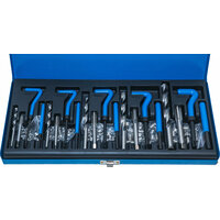 Набор включает специальные сверла, метчики, установочный и обламывающий инструмент, и резьбовые вставки пяти размеров (М5х0.8, М6х1, М8х1.25, М10х1.5, М12х1.75).