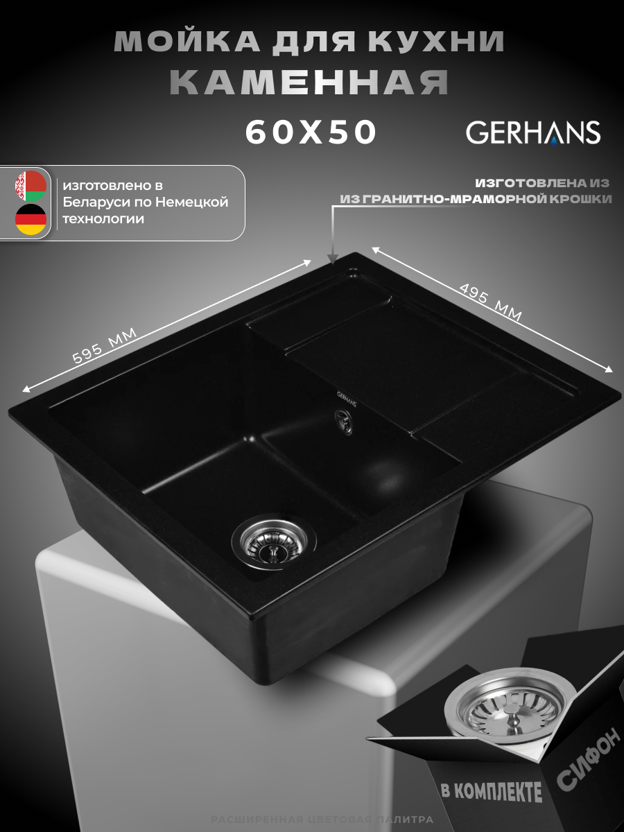 Глубокая каменная мойка GERHANS черного цвета с металлизированными вкраплениями, с крылом. Размер врезной раковины для кухонного шкафа 595х495 (±5) мм. Высота глубокой чаши 200 мм. Мойка полуматовая. Исполнение врезной раковины оборачиваемое. Универсальная мойка может устанавливаться крылом как в левую, так и в правую стороны. Отметки для высверливания отверстия намечены с обратной стороны крыла черной мойки. Вам остается выбрать нужную сторону и просверлить отверстие. Отверстие рекомендуется делать алмазной коронкой, диаметром 35 мм. Свойства угловой раковины для кухни: - Выдерживает термоудар до 180 градусов (не боится кипятка);- Не впитывает пищевые красители;- Не обладает микропористой поверхностью;- Защита от микро-царапин;- Защита от ультрафиолета;- Защита от грибковых поражений;- Защита от запахов;- Пространственное армирование;- Низкое температурное расширение;- Каменная мойка укомплектована именно тем сифоном, изображение которого размещено в карточке товара. Сифон с отводом для подключения посудомоечной (стиральной) машины и гофро-трубой. Выпуск и корзинный клапан изготовлены из нержавеющей стали, комплектующие и винт - из никелированной латуни. Лаконичная угловая мойка со строгими линиями и крылом для сушки посуды станут не только функциональной деталью кухни, но и украсят Ваш интерьер. Крыло для сушки посуды с двумя глубокими желобами для слива воды обеспечит ее свободный слив за счет легкого наклона к чаше.