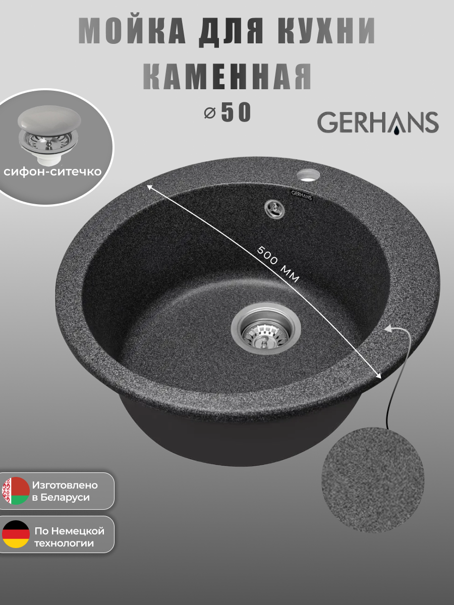 Кухонная мойка GERHANS A04 - 24 (графит) - это глубокая каменная мойка с круглой чашей, которая станет отличным дополнением к вашей кухне.