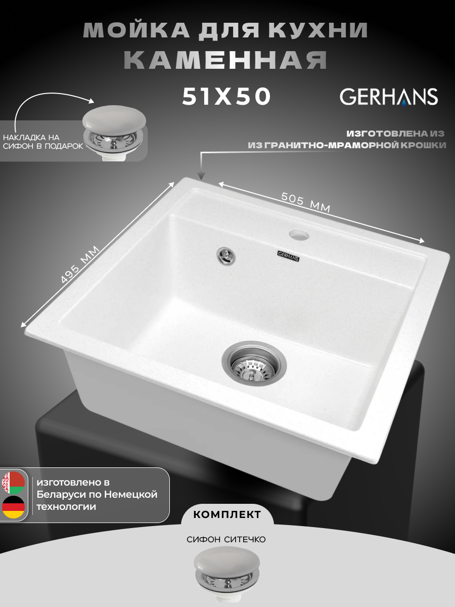 Мойка для кухни Gerhans A11-18 Белая 510х505 мм (Беларусь): сравнение цен, характеристики, фото, актуальное наличие и цены.