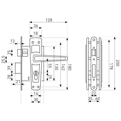 Замок врезной с ручками, цилиндровый. Предназначен для установки в деревянные двери толщиной 40мм, правого и левого открывания. Стальной оцинкованный корпус. Прямоугольный ригель из цинкового сплава, вылет 22мм. Межосевое расстояние 55мм. Удаление ключевого отверстия 55мм. Габаритный размер 85х130 мм. Ручки - алюминиевый сплав, покрытие - краска, крепление - стяжками. Комплектуется цилиндровым механизмом 70мм с 4 ключами. 15000 секретных комбинаций.