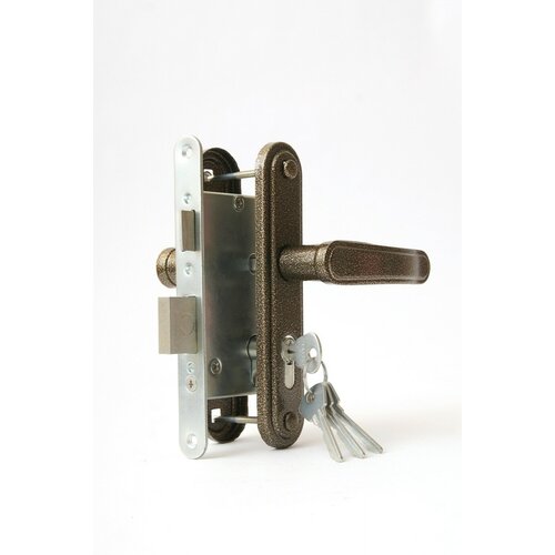 Замок врезной с ручками, цилиндровый. Предназначен для установки в деревянные двери толщиной 40-50мм, правого и левого открывания. Стальной оцинкованный корпус. Прямоугольный ригель из цинкового сплава, вылет 22мм. Межосевое расстояние 55мм. Удаление ключевого отверстия 55мм. Габаритный размер 85х130 мм. Ручки - сталь, алюминиевый сплав, покрытие - краска, крепление - стяжками. Комплектуется цилиндровым механизмом 70мм с 4 ключами. 15000 секретных комбинаций.