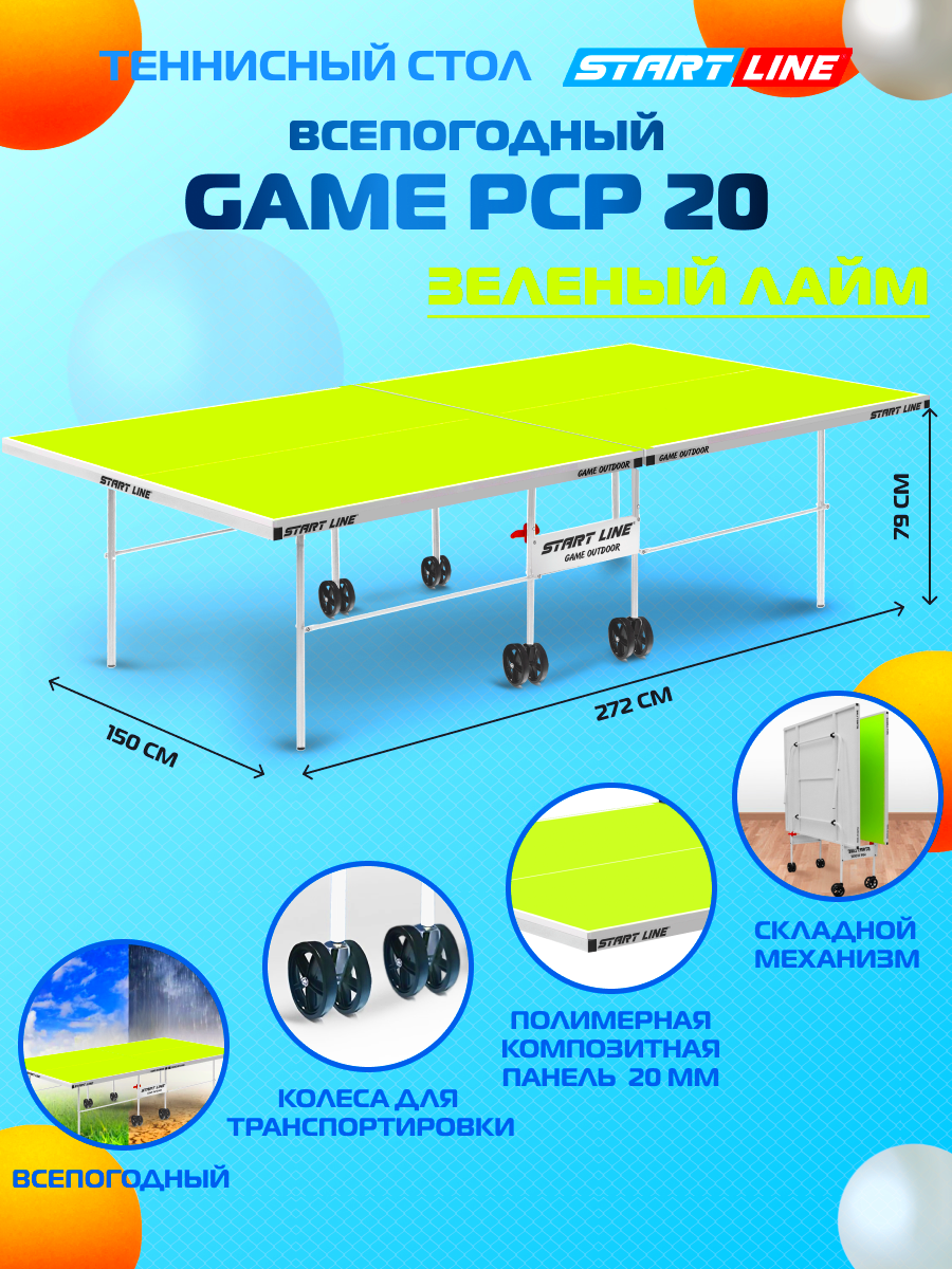 Новой моделью с новой столешницей PCP 20 мм стал теннисный стол Game Outdoor PCP 20. Это универсальный вариант всепогодного стола. Маневренность достигается за счет двойных обрезиненных роликов, модель легко перемещать. Конструкция предусматривает компактную систему трансформации и продумана таким образом, чтобы использовать его мог даже один человек.