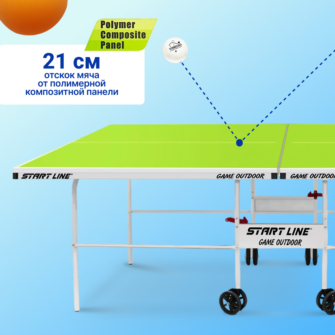 Игровое поле Polymer Composite Panel ( PCP) толщиной 20 мм – это собственная разработка Start Line. Преимущества Polymer Composite Panel ( PCP) - Материал РСР абсолютно устойчив к атмосферным явлениям, стол может эксплуатироваться на открытых площадках от -25°С до +35°С и высокой влажности. Панель РСР дает хороший отскок 21 см и сохраняет высокие игровые характеристики при длительном использовании на открытых площадках. Конструкция стола с панелью PCP имеет усиленную раму, которая задает дополнительную жесткость столу, закрепляет игровое поле и исключает «эффект барабана». Кромка столешницы толщиной 1 мм (вместо стандартной 0,45 мм) надежно защищает торец от повреждений. При толщине столешницы в 20 мм, стол остается легким и мобильным, что важно при его перемещении и транспортировке. Ультрасовременный дизайн теннисного стола не оставит равнодушным ни одного любителя настольного тенниса. Уникальный дерзкий стиль еще никем не продублирован!