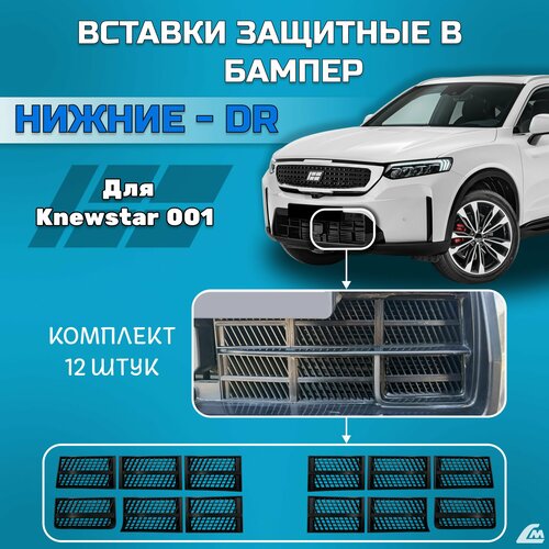 Вставки защитные в нижнюю решетку переднего бампера Knewstar-001 2024-, черные, рисунок DR. Предназначены для защиты радиатора от мусора и камней. В отличие от внешних защитных сеток данные вставки не портят внешнего вида автомобиля, но наоборот украшают его. Применяются вместо защитных сеток решетки радиатора Knewstar-001 2024-. Вставки изготовлены из пластика, обладающего высокой прочностью и морозостойкостью, не боятся ультрафиолетовых солнечных лучей и зимних дорожных реагентов. Устанавливаются очень быстро и легко, без применения каких-либо инструментов, дополнительных крепежей и без снятия бампера, держатся очень крепко. Комплект из 12 вставок.