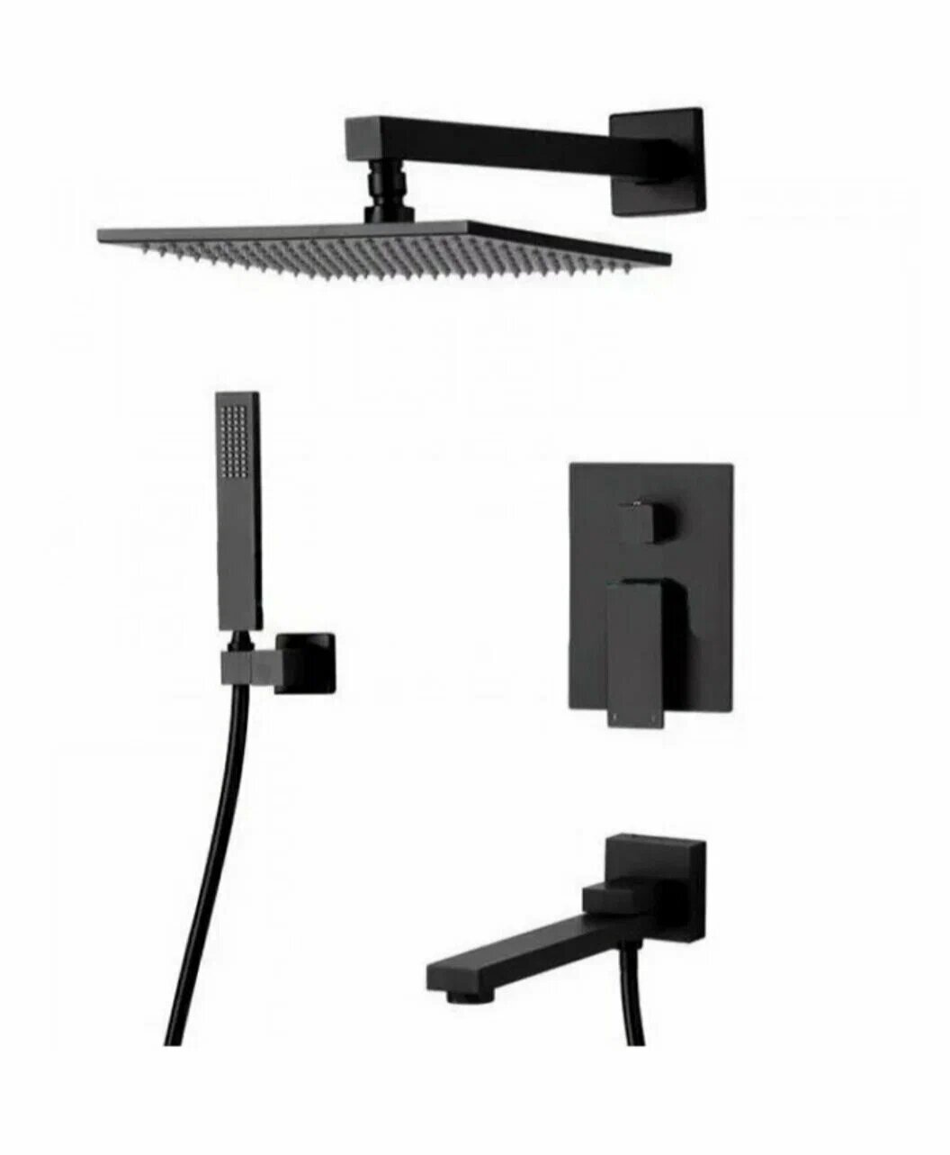| Комплектация | Смеситель, душевая лейка, шланг для душа, верхний душ, излив, настенный держатель |