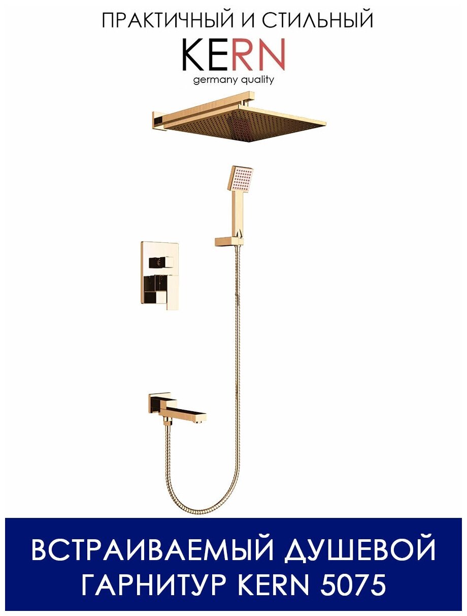Встраиваемый душевой гарнитур Kern 5075 - это стильное и практичное решение для вашей ванной комнаты. Встраиваемый душевой комплект монтируется в стену для скрытого подключения подводки. Комплект состоит из смесителя с изливом, ручного душа, шланга для душа и лейки для тропического душа. Все элементы душевого набора выполнены в одном стиле, который придаст необыкновенный вид ванной комнате. Смеситель имеет удобное рычажное управление, при помощи которого очень удобно регулировать напор и температуру воды. Также, смеситель оснащен аэратором с сеточкой, которая формирует мягкую и ровную струю воды, помогает экономить ее расход и задерживает различные частицы. Рычаг регулировки находится на удобной высоте, что делает его использование максимально комфортным. Лейка для тропического душа имеет квадратную форму со стороной 250 или 300 мм (выбор в карточке товара).