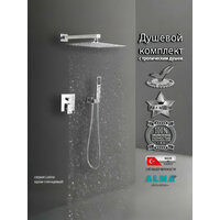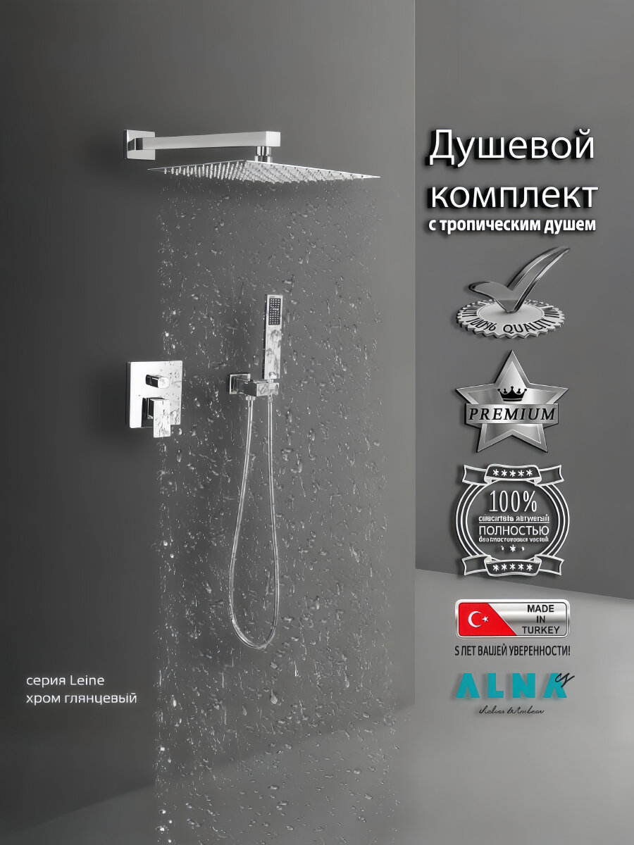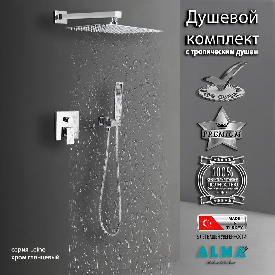 Изготовитель: Турция. Гарантия на смеситель (корпус):5 лет. Гарантия на комплектующие:1 год. Душевая система (душевой комплект) серии Leine бренда ALMAes со смесителем и тропическим душем на 2 потребителя, в цвете хром с глянцевым покрытием, имеет минималистичный дизайн и продуманную эргономику. Продуманная конструкция дает гарантию, что сантехника не утратит ни внешней привлекательности, ни своих функциональных качеств даже спустя длительное время. Душ в ванной комнате в определенной степени является обязательным элементом, обеспечивающим полноценные гигиенические условия и достаточное релаксирующее воздействие! Поэтому начнем с верхней лейки которая оборудована тропическим душем!