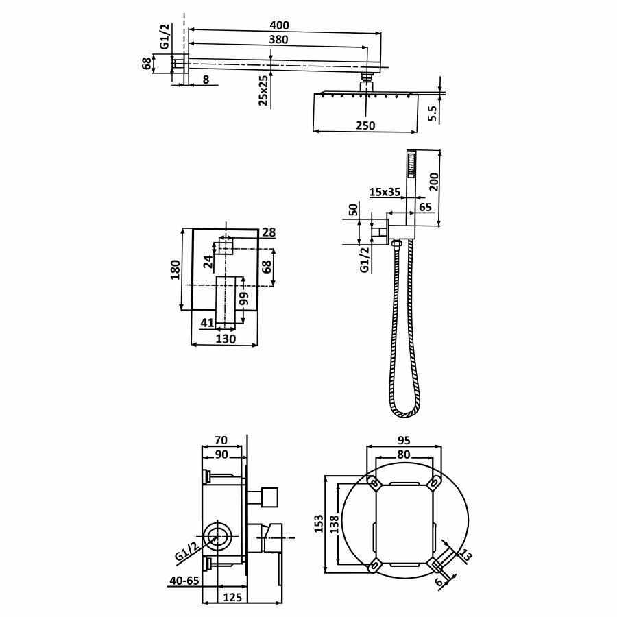 ●Верхний душ: 250*250 мм, нержавеющая сталь;