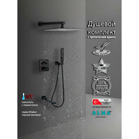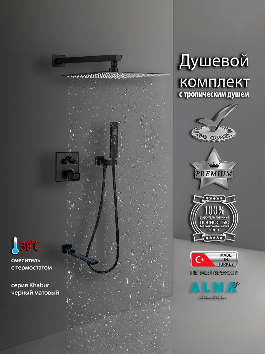 Встраиваемая Душевая Система Со Смесителем С Термостатом И Тропическим Душем На 3 Потребителя Черная Матовая Khabur TVZ-0897 ALMAes Латунь