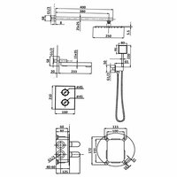 Излив поворотный латунь 24 см, верхняя лейка нержавеющая сталь размер 25*25 см, длинна верхнего кронштейна 40 см, шланг 150 см, лейка ручная нержавеющая сталь, встраиваемый смеситель-термостат на 3 положения, материал латунь, немецкий картридж, глубина его погружения в стену 8 см