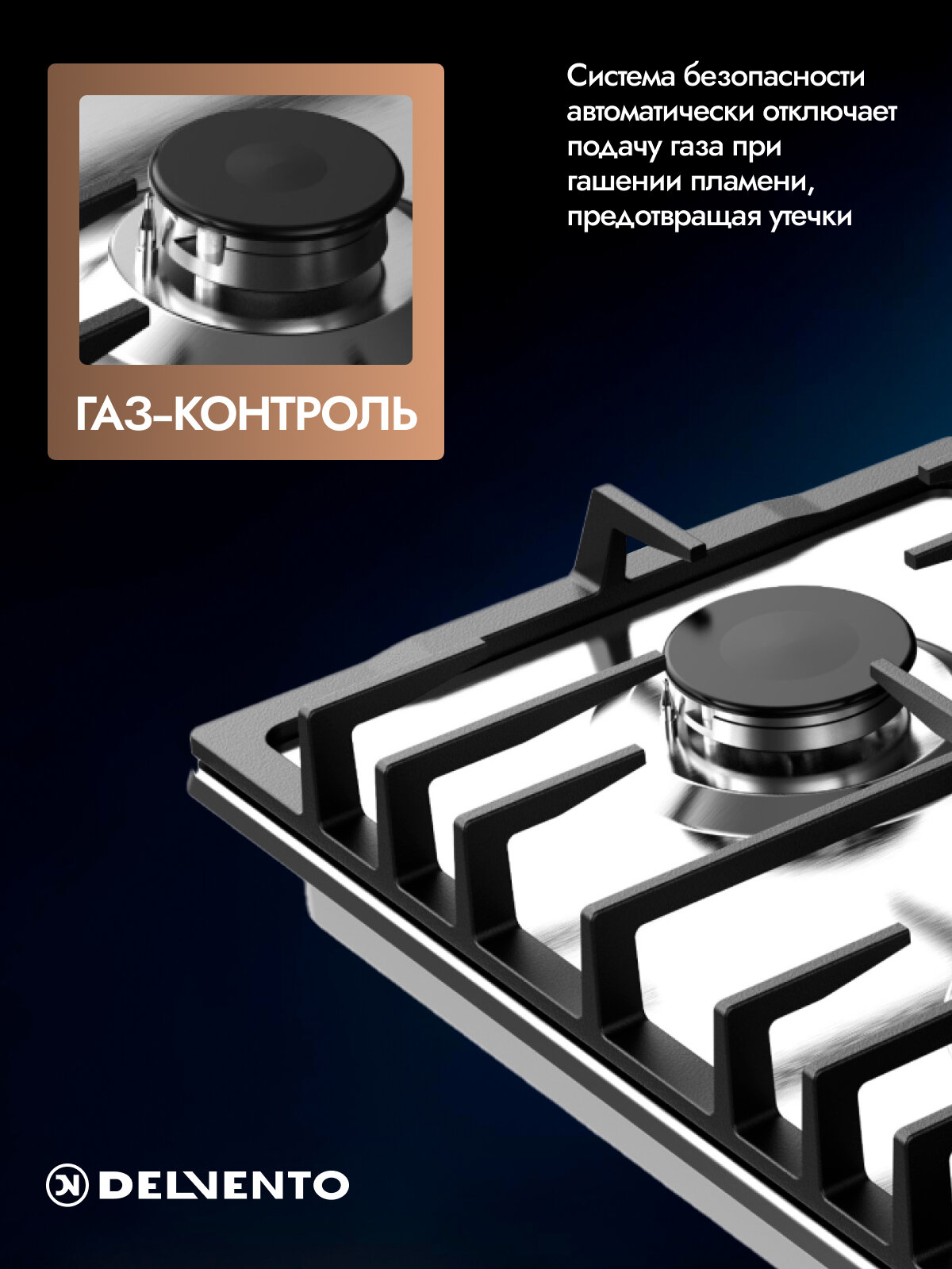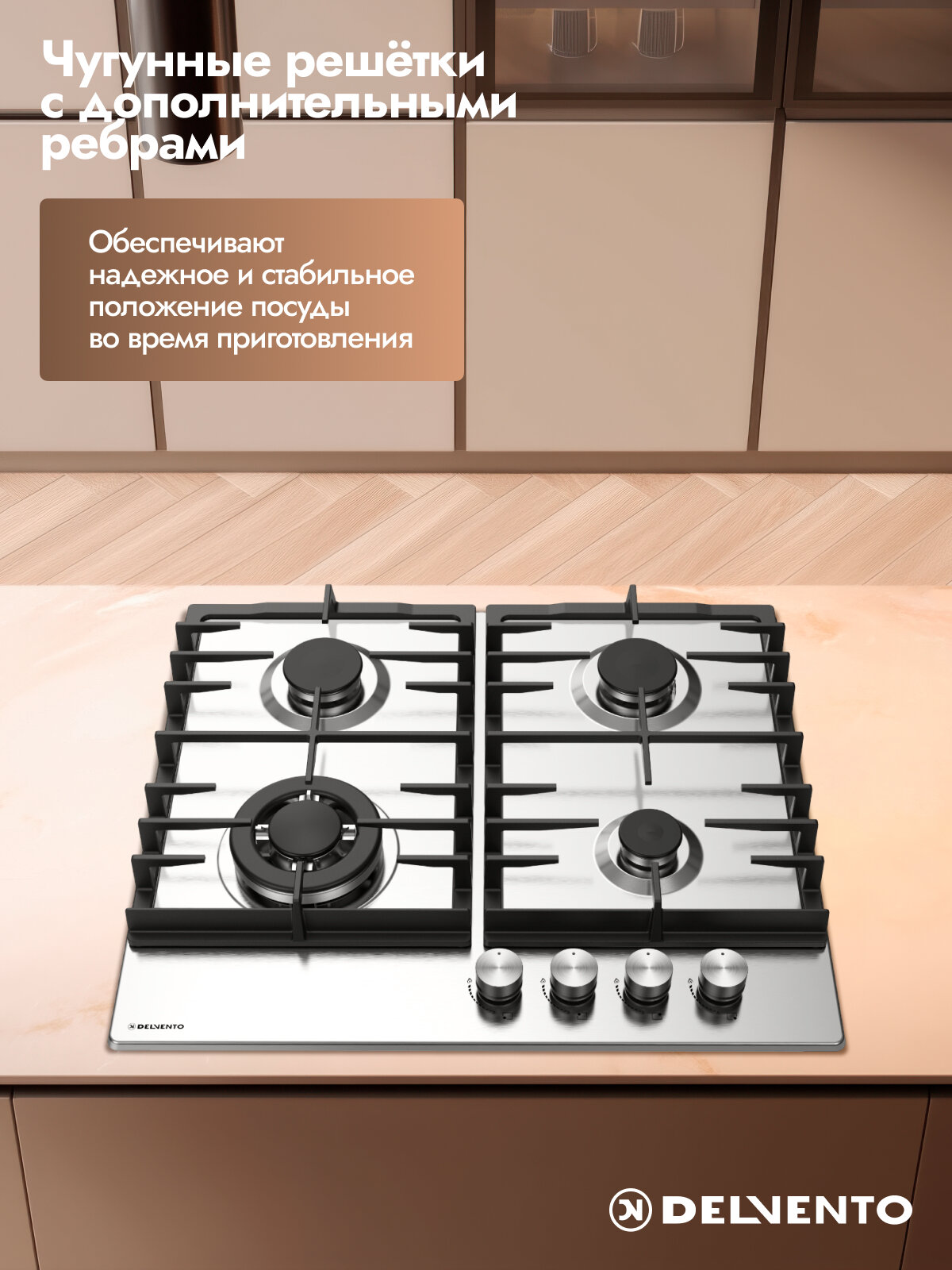 Купить Встраиваемая газовая варочная панель 60см DELVENTO V60V41M100 газ-контроль автоподжиг чугунная решетка WOK с доставкой по всей России.