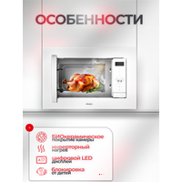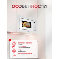 | Особенности | без поворотного стола, блокировка от детей, дисплей, кнопка +30 секунд, подсветка камеры, программирование рецептов в память, система равномерного распределения микроволн, функция задержки пуска |