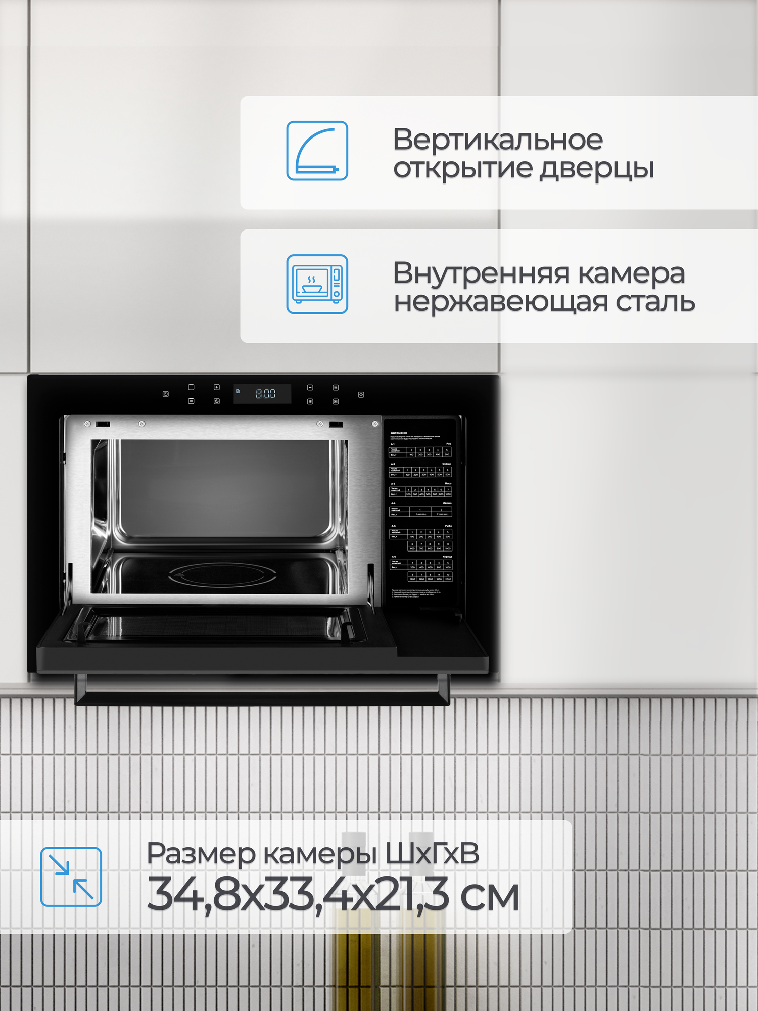 | Особенности | без поворотного стола, блокировка от детей, дисплей, кнопка +30 секунд, подсветка камеры, система равномерного распределения микроволн |