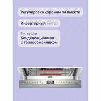 автоматическая установка жесткости воды, автоматическое открывание дверцы по завершении цикла, внутренняя поверхность из нержавеющей стали, дисплей, использование средств 3 в 1, проточный водонагреватель, регулируемая по высоте корзина для посуды, сенсор чистоты воды, таймер отсрочки