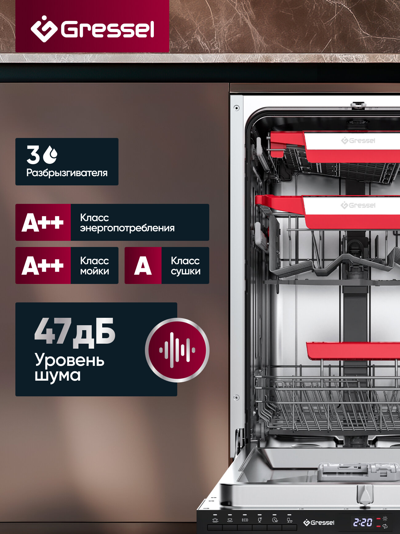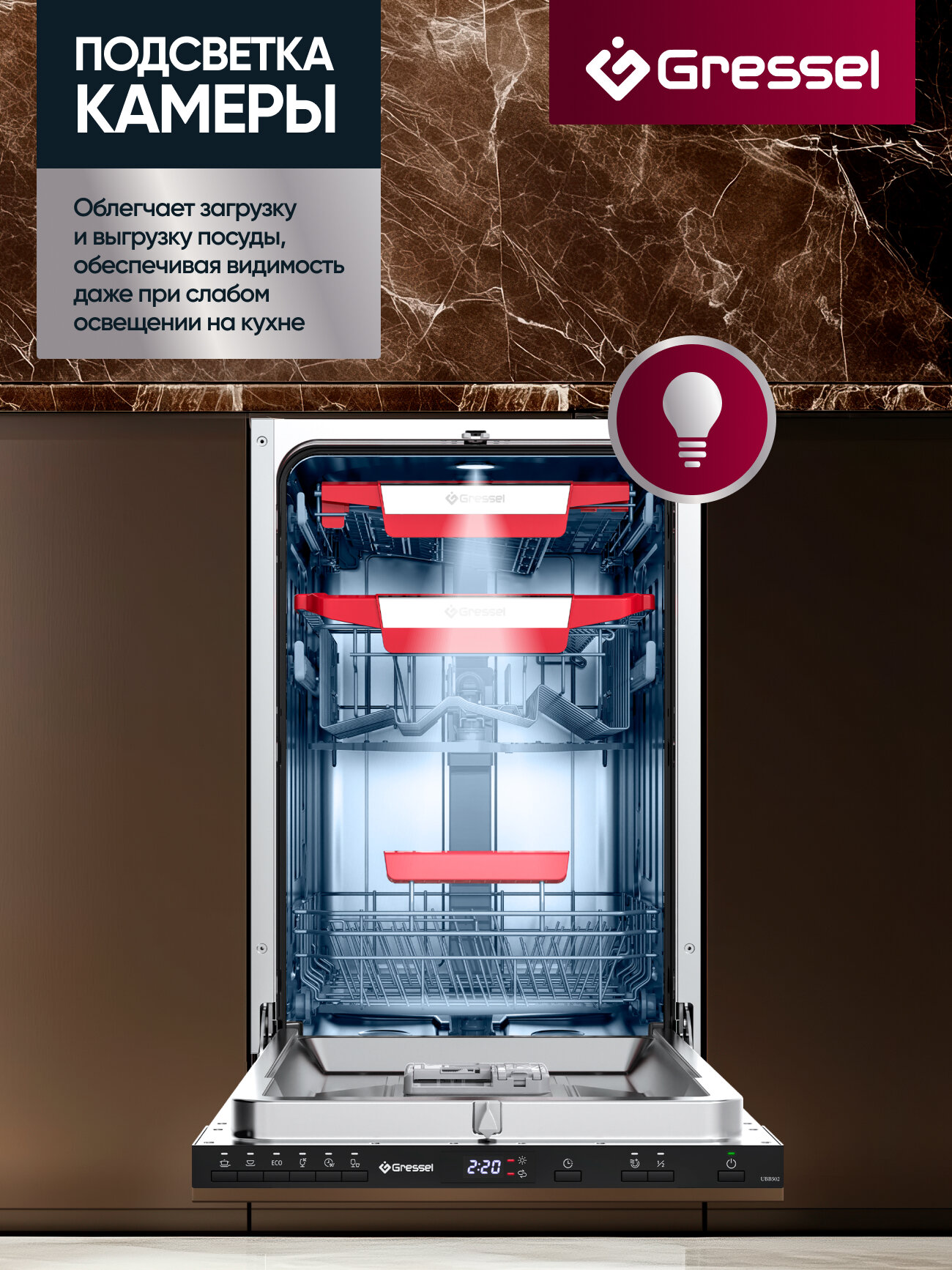 Встраиваемая посудомоечная машина Gressel UBB535 45 см, 3 корзины, 6 программ, 10 комплектов, луч на полу, AQUASTOP, подсветка: сравнение цен, характеристики, фото, актуальное наличие и цены.