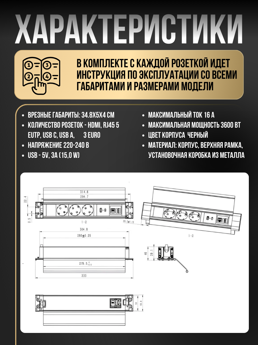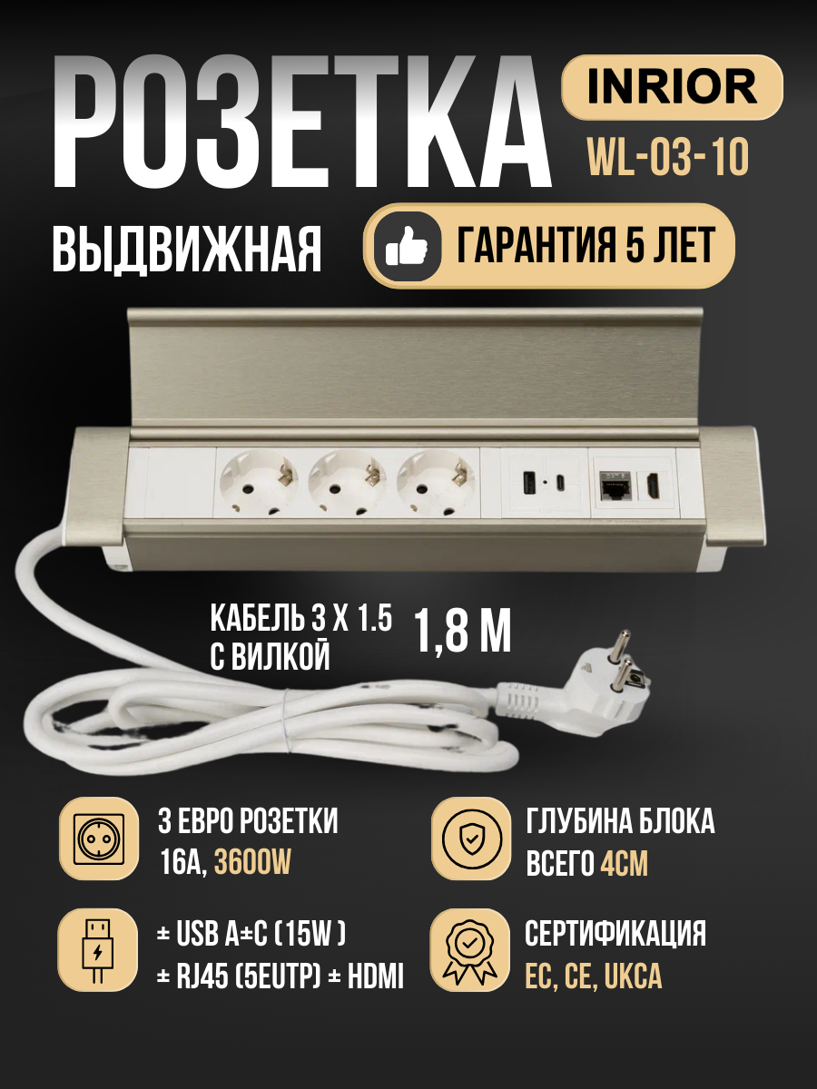 Встраиваемая розетка для столешницы на 3 ЕВРО, USB A + C, HDMI и RJ45, скрытая. с заземлением, белая, тройник: сравнение цен, характеристики, фото, актуальное наличие и цены.