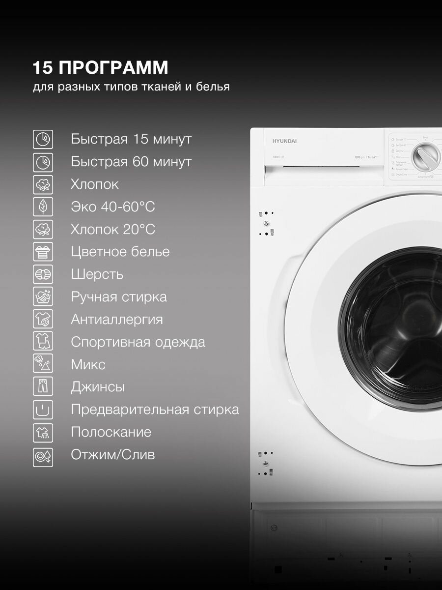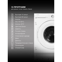 | Программы | быстрая стирка, гипоаллергенная стирка, дополнительное полоскание, интенсивная стирка, отжим, полоскание, предварительная стирка, ручная стирка, стирка деликатных тканей, стирка детских вещей, стирка джинсов, стирка паром, стирка пуховых вещей, стирка синтетики, стирка смешанных тканей, стирка спортивной одежды, стирка хлопка, стирка цветных вещей, стирка шелка, стирка шерсти, удаление пятен, экономичная программа |