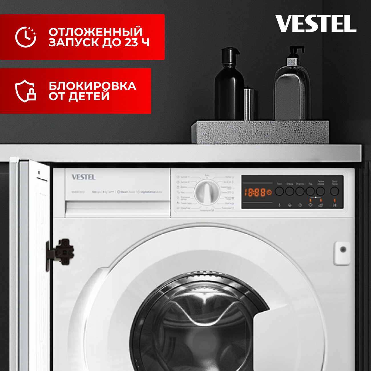 Встраиваемая стиральная машина VESTEL, загрузка 8кг, 1200 об/мин, дозагрузка белья, обработка паром, 15 программ: сравнение цен, характеристики, фото, актуальное наличие и цены.