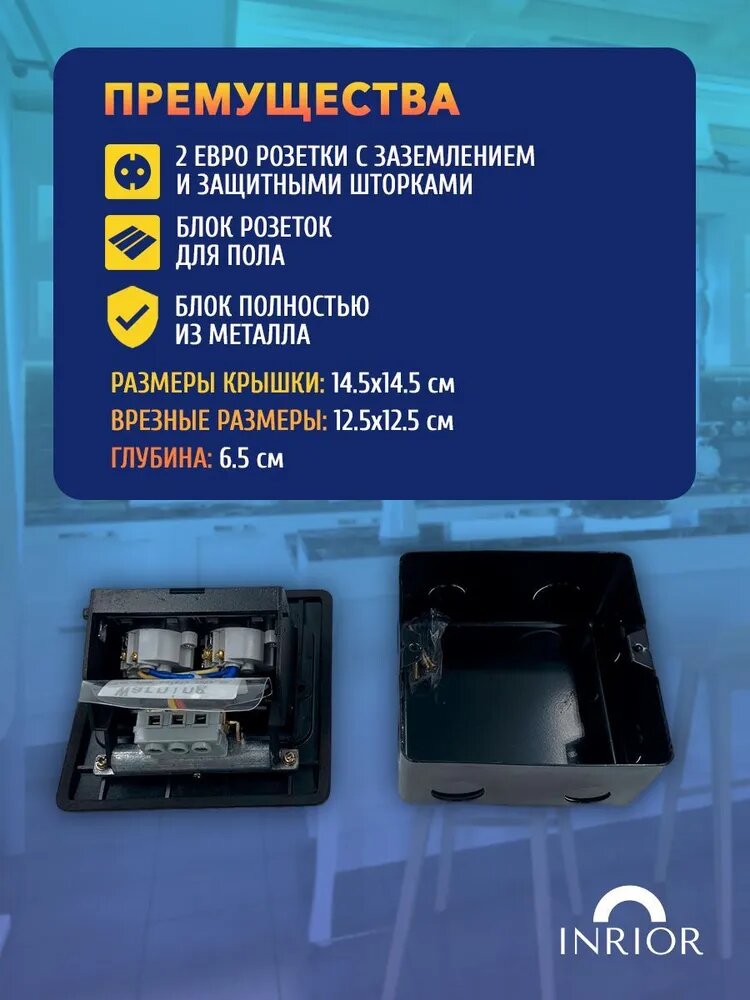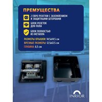 Розетка подходит для ванной. Данная розетка подходит для фальшпола, так же наливного пола, заливного пола, жидкого пола, и для всех видов полов. Розетка для установки в пол DB-02-33, влагозащитная IP55, 2 Евро розетки. Врезное отверстие: 125x125 мм. Глубина: 65 мм. Цвет: черный