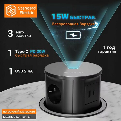 Встраиваемая выдвижная розетка для столешницы с беспроводной зарядкой 15W, скрытый удлинитель для кухни на 3 розетки + USB и TYPE-C, быстрая зарядка, заземление, провод 1.8м: сравнение цен, характеристики, фото, актуальное наличие и цены.