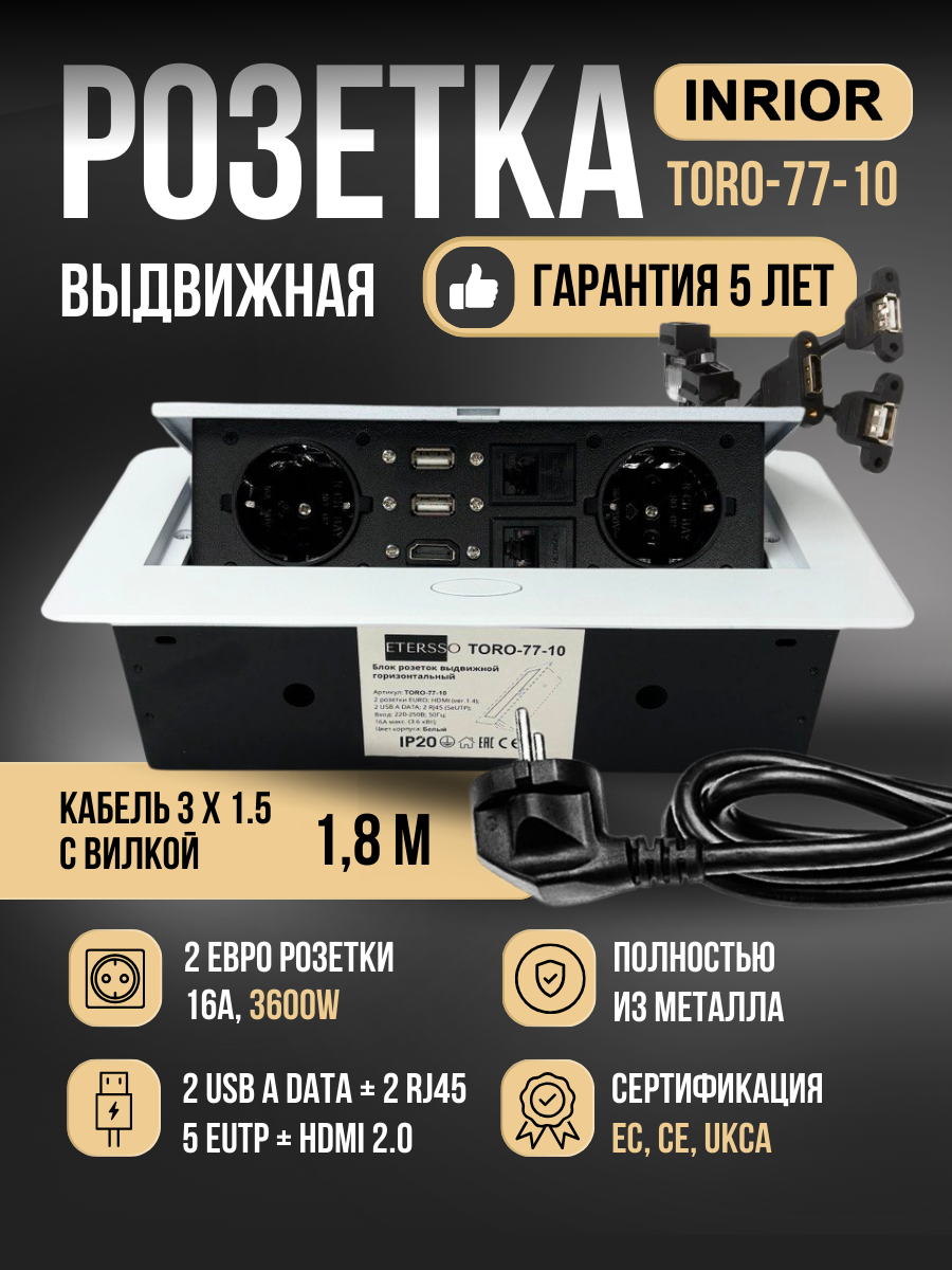 Комплектация: Полностью в сборе с внутренней проводкой, монтажной коробкой, проводом 1.8 м с вилкой, RJ45 порты выполнены как удлинители, USB на передачу данных