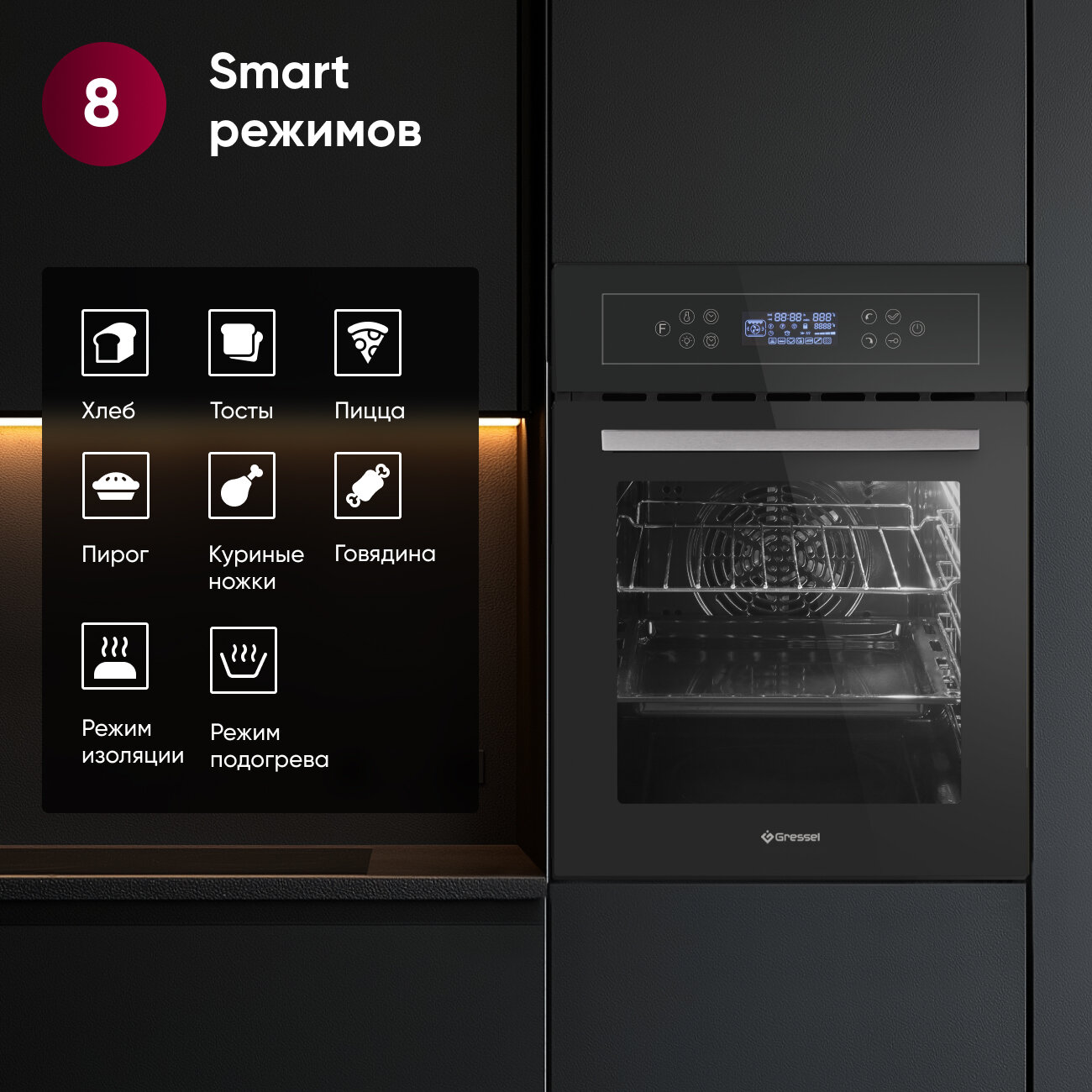Откройте новые гастрономические горизонты с Gressel U4ES99000. При ширине 45 см и объёме 50 л он оснащён 10 режимами, среди которых 8 автопрограмм: от подогрева и «Пиццы» до «Тостов» и запекания говядины. Это значит, что даже сложные рецепты станут проще: достаточно выбрать соответствующую программу на сенсорном дисплее. Тройное остекление дверцы обеспечивает безопасность и поддерживает стабильную температуру внутри. Система автоотключения исключает перегрев, а вентилятор охлаждения заботится о смежной мебели. Режимы конвекции и двойного гриля позволяют экспериментировать с текстурами и степенью прожарки, а «Разморозка» упрощает заготовку продуктов. Цифровой таймер рассчитан на долгое время приготовления, а сенсорная панель управления смотрится стильно и упрощает настройку параметров. Если вы любите, чтобы техника сама подсказывала настройки для разных блюд, эти автопрограммы будут большой подмогой. Gressel U4ES99000 гармонично объединяет компактность, многофункциональность и современный дизайн, помогая вам готовить блюда ресторанного уровня даже на небольшой кухне.