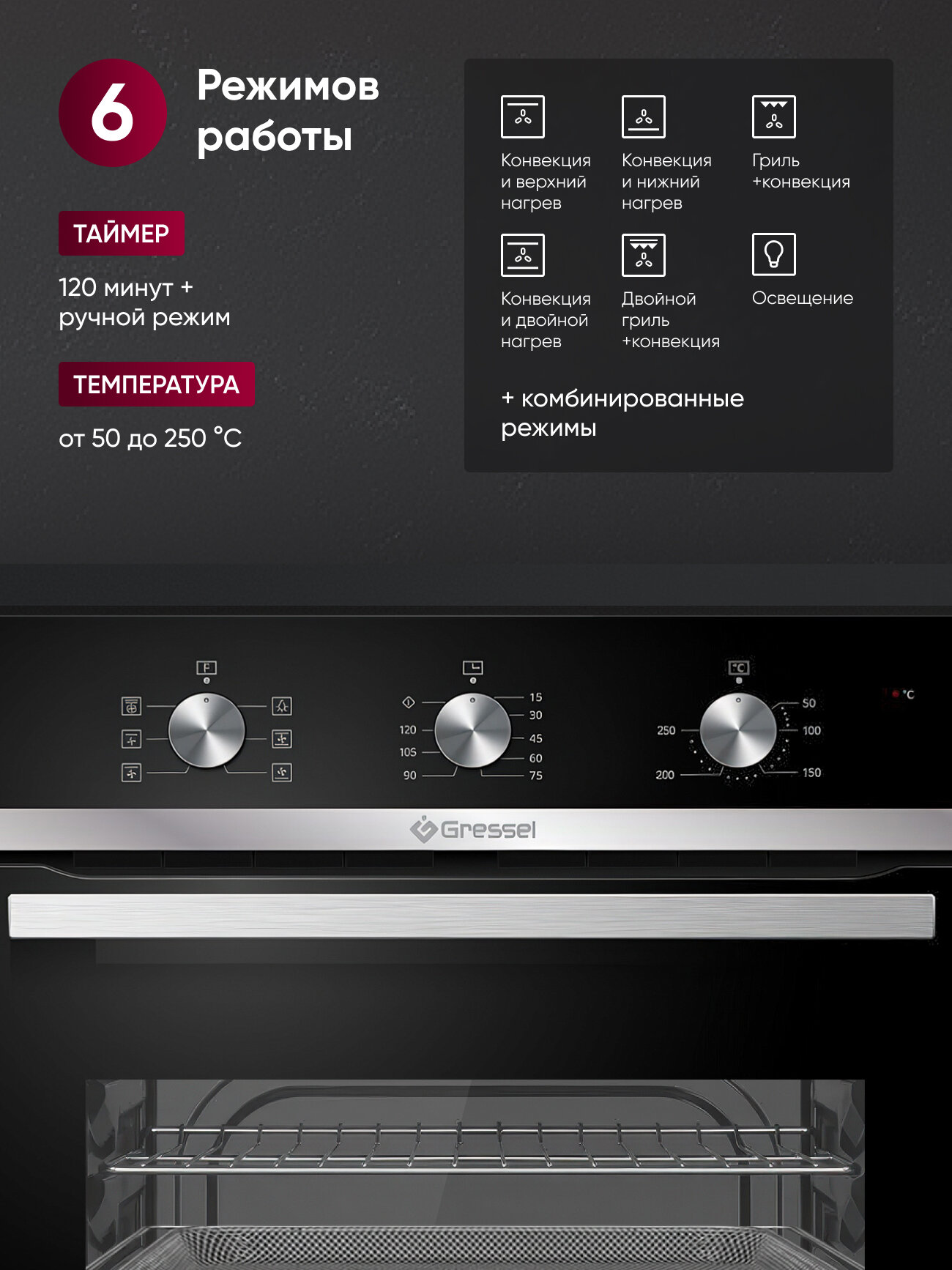 | Режимы | большой гриль, верхний нагрев, верхний нагрев + нижний нагрев, верхний нагрев + нижний нагрев + конвекция, гриль, гриль + конвекция, конвекция, нижний нагрев, нижний нагрев + конвекция |