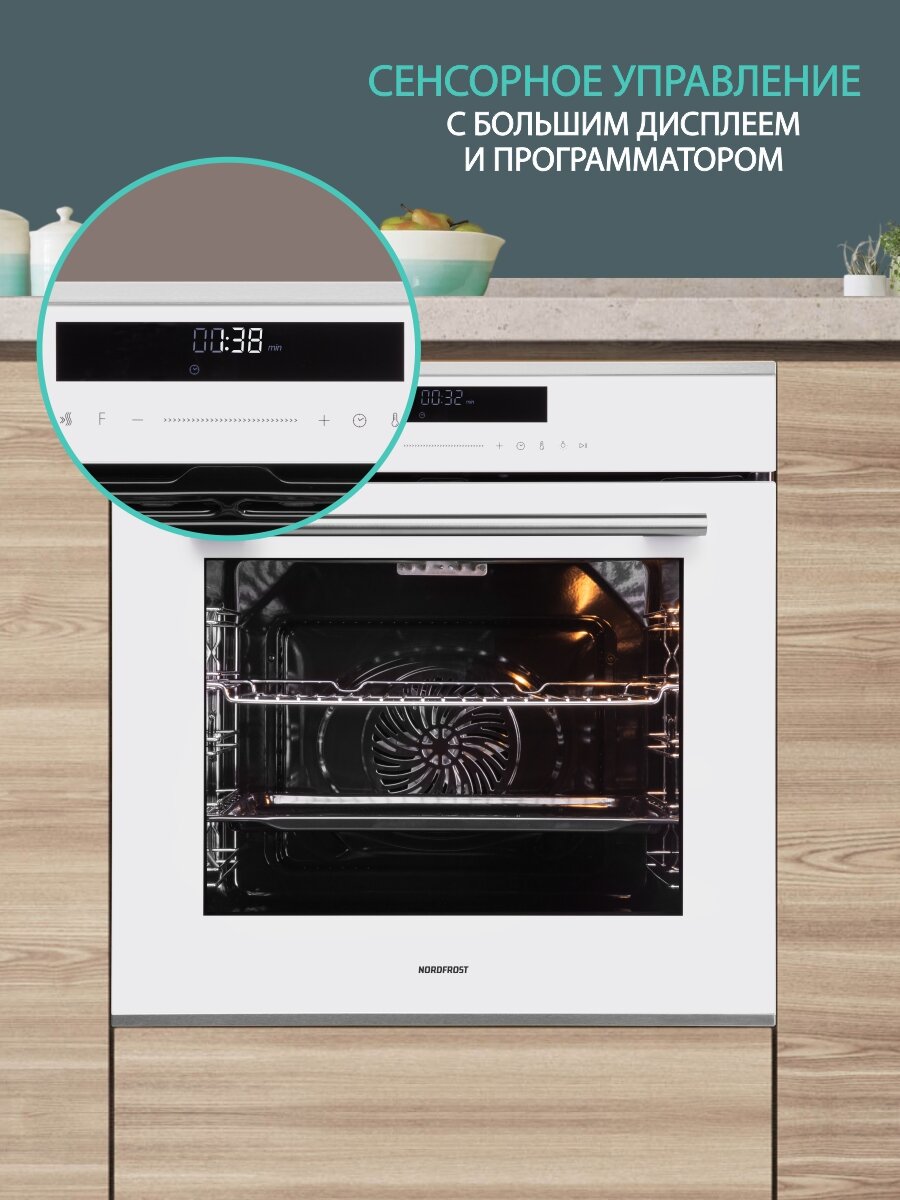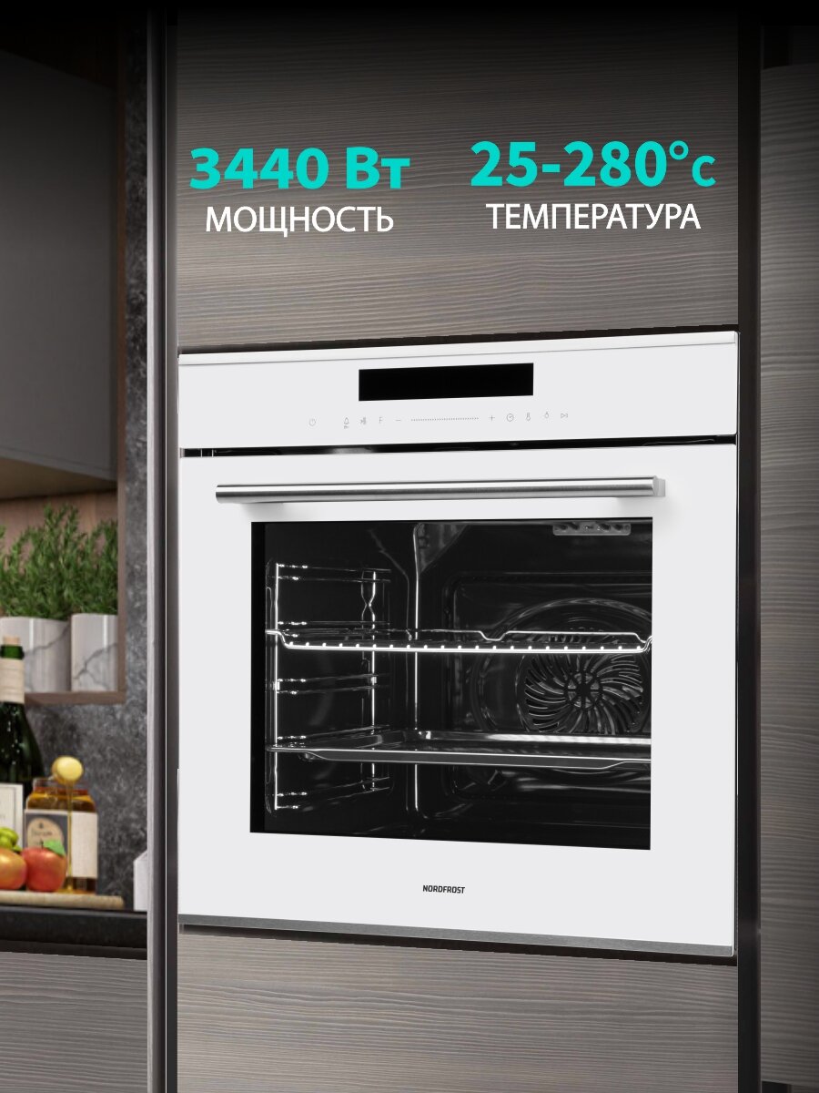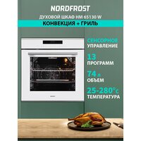 Купить Встраиваемый духовой шкаф NORDFROST HM 65130 W, объём 74 л, конвекция, гриль, 4D-обдув, ферментация, белое стекло с доставкой по всей России.