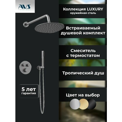 Купить Встраиваемый душевой комплект скрытого монтажа AVS Luxury с тропическим душем и смесителем с термостатом без излива оружейная сталь, латунь, круг с доставкой по всей России. Встраиваемый душевой комплект скрытого монтажа AVS Luxury с тропическим душем и смесителем с термостатом без излива оружейная сталь, латунь, круг: сравнение цен, характеристики, фото, актуальное наличие и цены.