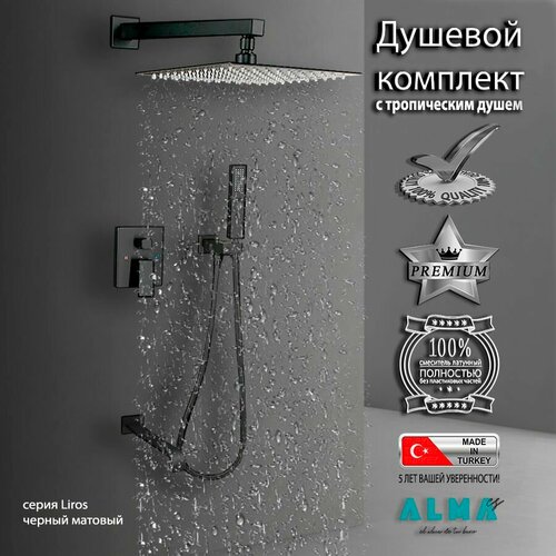 Изготовитель: Турция. Гарантия на смеситель (корпус): 5 лет. Гарантия на комплектующие: 1 год. Душевая система (душевой комплект) серии Liros бренда ALMAes со смесителем и тропическим душем на 3 потребителя, в черном цвете с матовым покрытием, имеет минималистичный дизайн и продуманную эргономику. Продуманная конструкция дает гарантию, что сантехника не утратит ни внешней привлекательности, ни своих функциональных качеств даже спустя длительное время. Душ в ванной комнате в определенной степени является обязательным элементом, обеспечивающим полноценные гигиенические условия и достаточное релаксирующее воздействие! Поэтому начнем с верхней лейки которая оборудована тропическим душем!