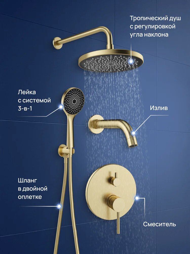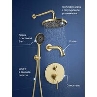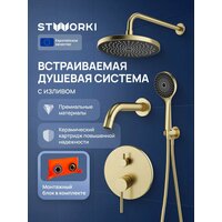 Встраиваемый душевой комплект STWORKI Эстерсунд S31240GM 5 в 1, с внутренней частью в комплекте, со смесителем, с изливом, с верхним душем, латунный, золотой матовый
