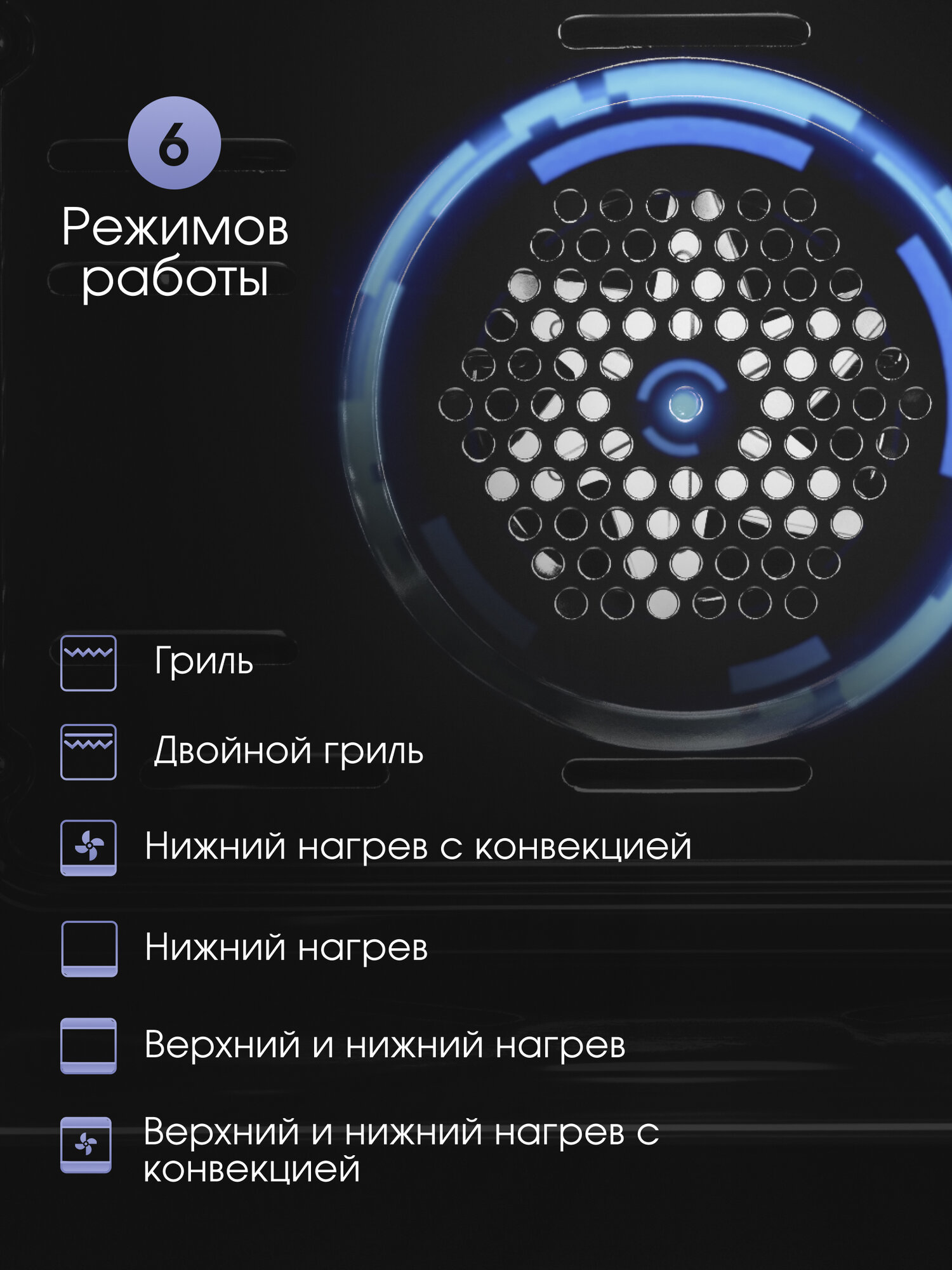 большой гриль, верхний нагрев, верхний нагрев + нижний нагрев, верхний нагрев + нижний нагрев + конвекция, гриль, конвекция, нижний нагрев, нижний нагрев + конвекция