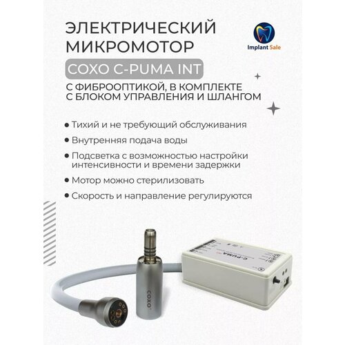 C-PUMA INT - устройство, используемое специалистами при таких видах лечения, как терапевтическое и ортопедическое. Бесшумный бесщёточный микромотор устанавливается в стоматологическую установку. Особенности заключаются в регулируемой скорости и направлении вращения, а также яркости световой подсветки, достигающей 20 000 люкс. Максимальная скорость вращения микромотора составляет 40 000 об/мин. C-PUMA INT оснащен охлаждающей жидкостью и охлаждающим воздухом, что предотвращают перегрев стоматологического инструмента.